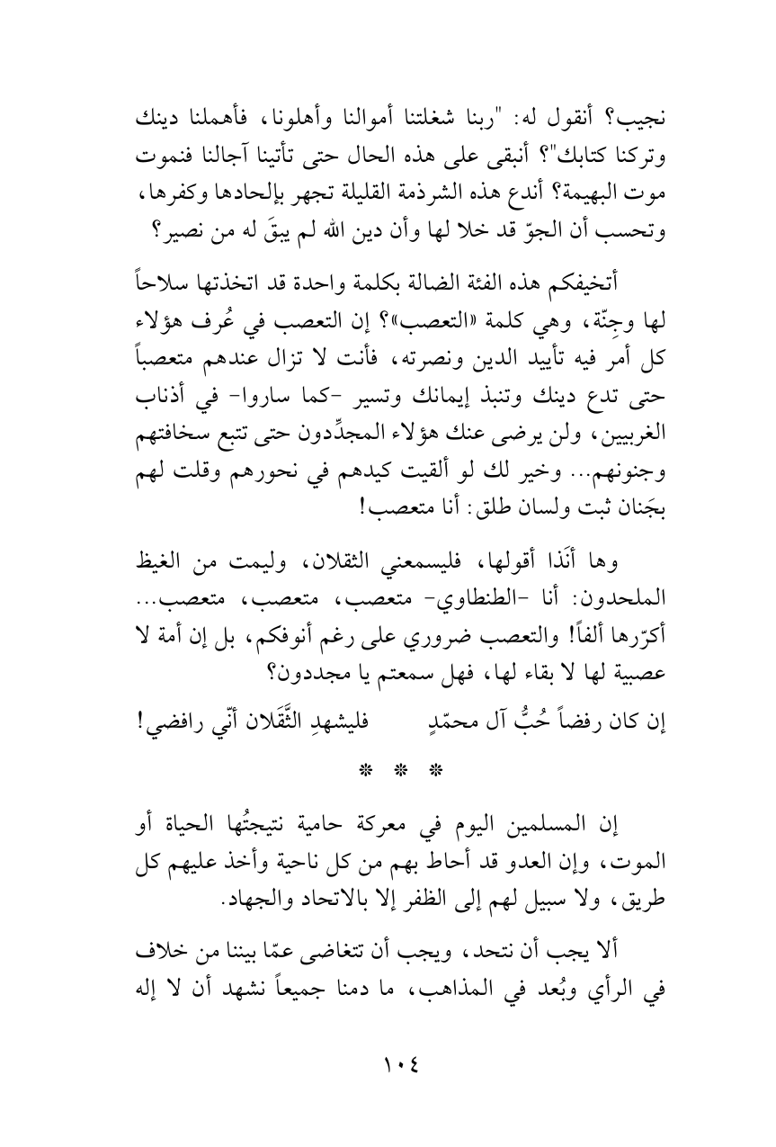 نجيب؟ أنقول له: "ربنا شغلتنا أموالنا وأهلونا، فأهملنا دينك وتركنا كتابك"؟ أنبقى على هذه الحال حتى تأتينا آجالنا فنموت موت البهيمة؟ أندع هذه الشرذمة القليلة تجهر بإلحادها وكفرها، وتحسب أن الجوّ قد خلا لها وأن دين الله لم يبقَ له من نصير؟