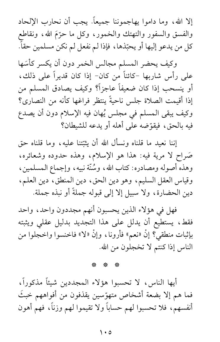 أيها الناس، لا تحسبوا هؤلاء المجددين شيئاً مذكوراً، فما هم إلا بضعة أشخاص متهوّسين يقذفون من أفواههم خبثَ أنفسهم، فلا تحسبوا لهم حساباً ولا تقيموا لهم وزناً، فهم أهون