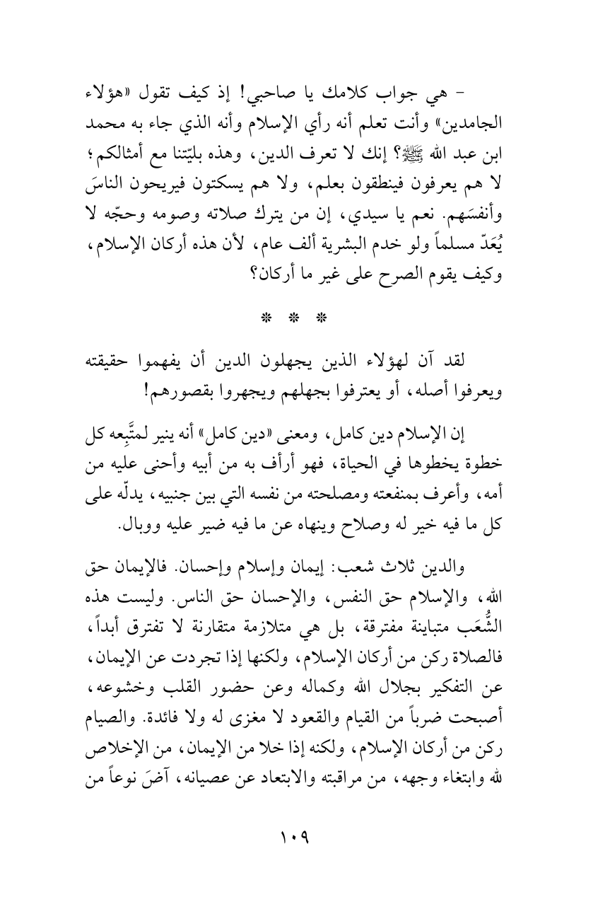 - هي جواب كلامك يا صاحبي! إذ كيف تقول «هؤلاء الجامدين» وأنت تعلم أنه رأي الإسلام وأنه الذي جاء به محمد ابن عبد الله صلى الله عليه وسلم؟ إنك لا تعرف الدين، وهذه بليّتنا مع أمثالكم؛ لا هم يعرفون فينطقون بعلم، ولا هم يسكتون فيريحون الناسَ وأنفسَهم. نعم يا سيدي، إن من يترك صلاته وصومه وحجّه لا يُعَدّ مسلماً ولو خدم البشرية ألف عام، لأن هذه أركان الإسلام، وكيف يقوم الصرح على غير ما أركان؟
