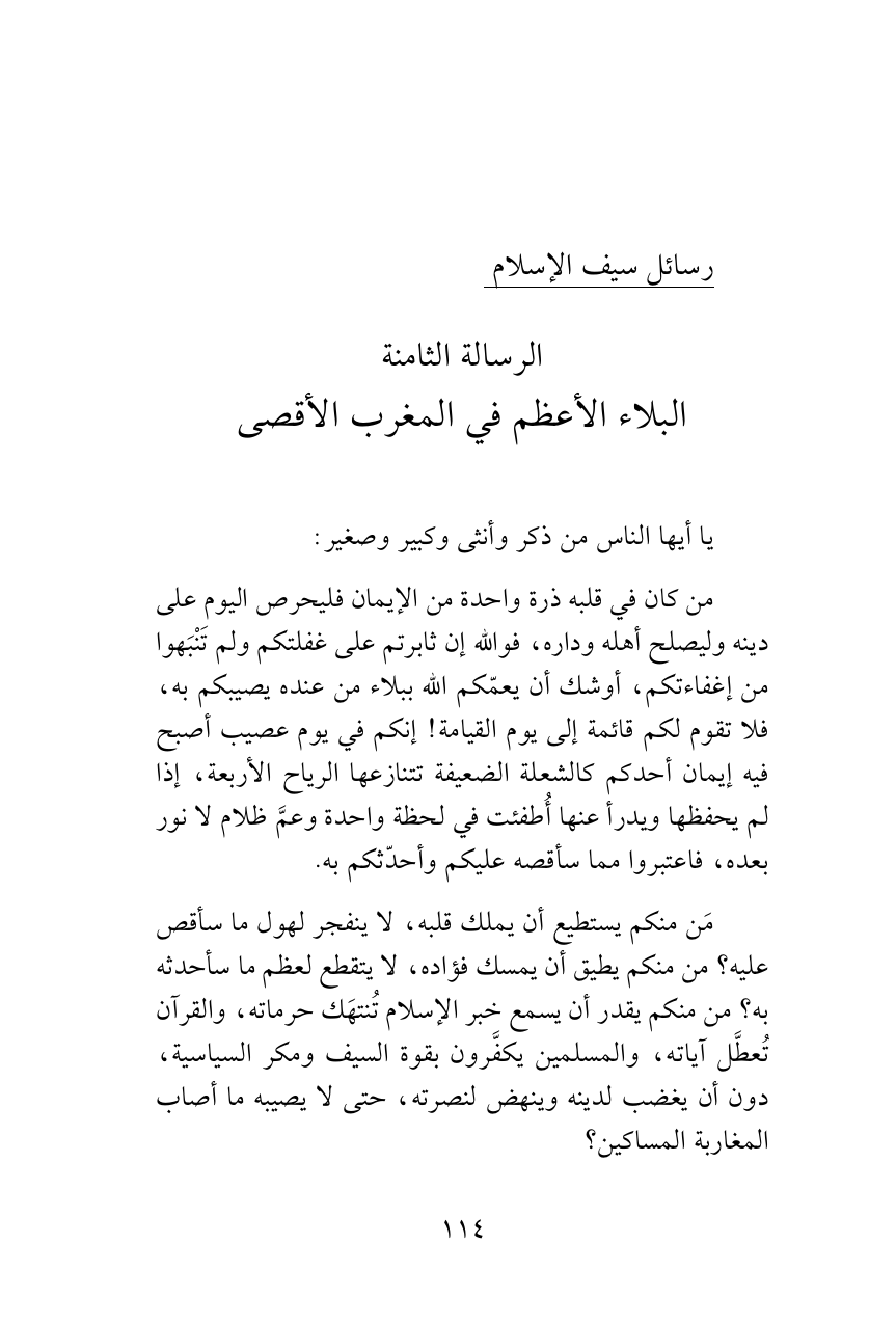 مَن منكم يستطيع أن يملك قلبه، لا ينفجر لهول ما سأقص عليه؟ من منكم يطيق أن يمسك فؤاده، لا يتقطع لعظم ما سأحدثه به؟ من منكم يقدر أن يسمع خبر الإسلام تُنتهَك حرماته، والقرآن تُعطَّل آياته، والمسلمين يكفَّرون بقوة السيف ومكر السياسية، دون أن يغضب لدينه وينهض لنصرته، حتى لا يصيبه ما أصاب المغاربة المساكين؟