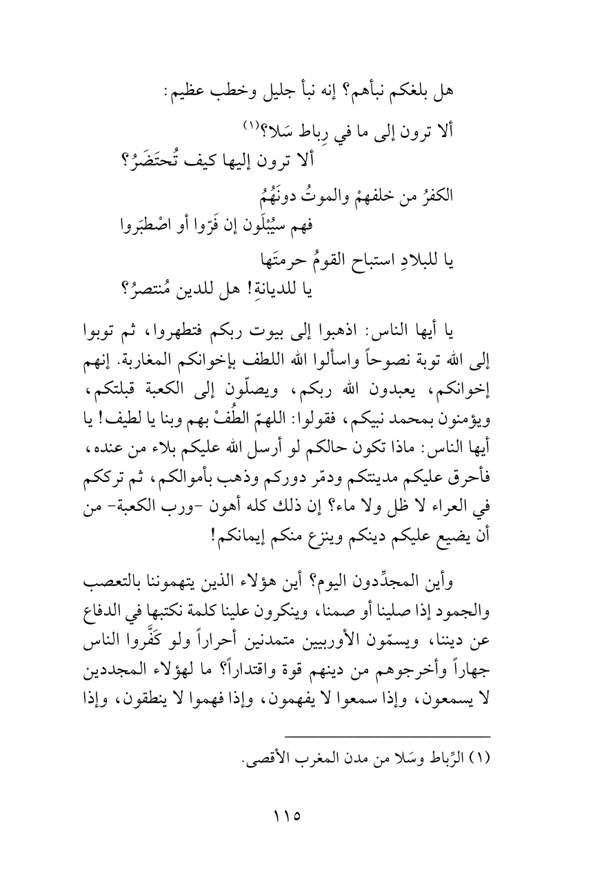 يا أيها الناس: اذهبوا إلى بيوت ربكم فتطهروا، ثم توبوا إلى الله توبة نصوحاً واسألوا الله اللطف بإخوانكم المغاربة. إنهم إخوانكم، يعبدون الله ربكم، ويصلّون إلى الكعبة قبلتكم، ويؤمنون بمحمد نبيكم، فقولوا: اللهمّ الطُفْ بهم وبنا يا لطيف! يا أيها الناس: ماذا تكون حالكم لو أرسل الله عليكم بلاء من عنده، فأحرق عليكم مدينتكم ودمّر دوركم وذهب بأموالكم، ثم ترككم في العراء لا ظل ولا ماء؟ إن ذلك كله أهون -ورب الكعبة- من أن يضيع عليكم دينكم وينزع منكم إيمانكم!