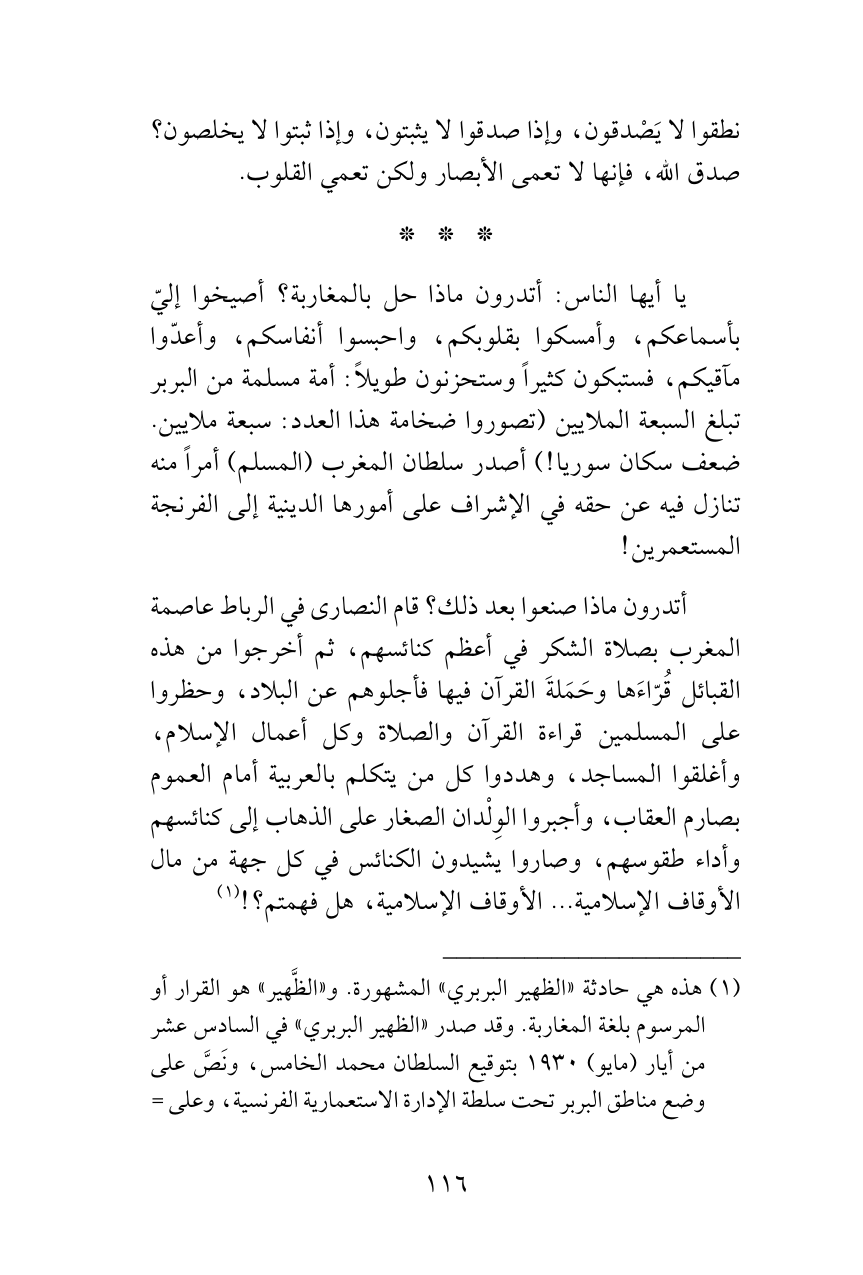 يا أيها الناس: أتدرون ماذا حل بالمغاربة؟ أصيخوا إليّ بأسماعكم، وأمسكوا بقلوبكم، واحبسوا أنفاسكم، وأعدّوا مآقيكم، فستبكون كثيراً وستحزنون طويلاً: أمة مسلمة من البربر تبلغ السبعة الملايين (تصوروا ضخامة هذا العدد: سبعة ملايين. ضعف سكان سوريا!) أصدر سلطان المغرب (المسلم) أمراً منه تنازل فيه عن حقه في الإشراف على أمورها الدينية إلى الفرنجة المستعمرين!
