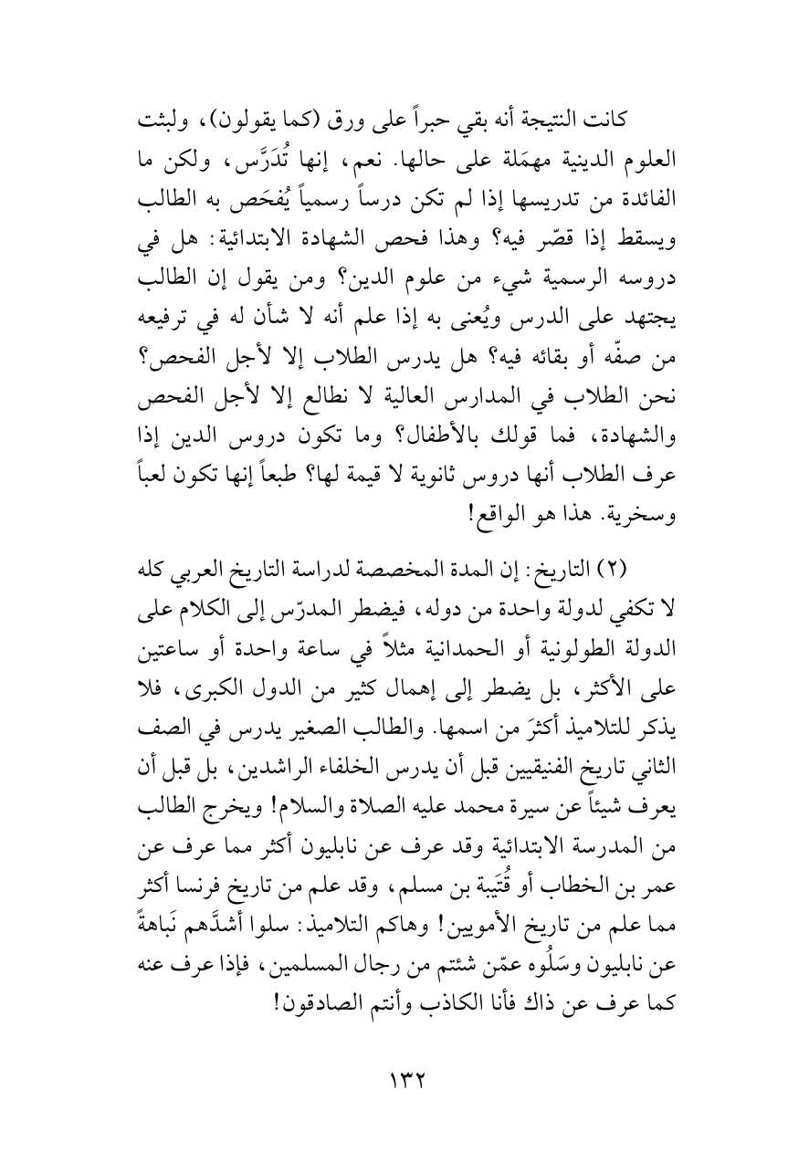(2) التاريخ: إن المدة المخصصة لدراسة التاريخ العربي كله لا تكفي لدولة واحدة من دوله، فيضطر المدرّس إلى الكلام على الدولة الطولونية أو الحمدانية مثلاً في ساعة واحدة أو ساعتين على الأكثر، بل يضطر إلى إهمال كثير من الدول الكبرى، فلا يذكر للتلاميذ أكثرَ من اسمها. والطالب الصغير يدرس في الصف الثاني تاريخ الفنيقيين قبل أن يدرس الخلفاء الراشدين، بل قبل أن يعرف شيئاً عن سيرة محمد عليه الصلاة والسلام! ويخرج الطالب من المدرسة الابتدائية وقد عرف عن نابليون أكثر مما عرف عن عمر بن الخطاب أو قُتَيبة بن مسلم، وقد علم من تاريخ فرنسا أكثر مما علم من تاريخ الأمويين! وهاكم التلاميذ: سلوا أشدَّهم نَباهةً عن نابليون وسَلُوه عمّن شئتم من رجال المسلمين، فإذا عرف عنه كما عرف عن ذاك فأنا الكاذب وأنتم الصادقون!