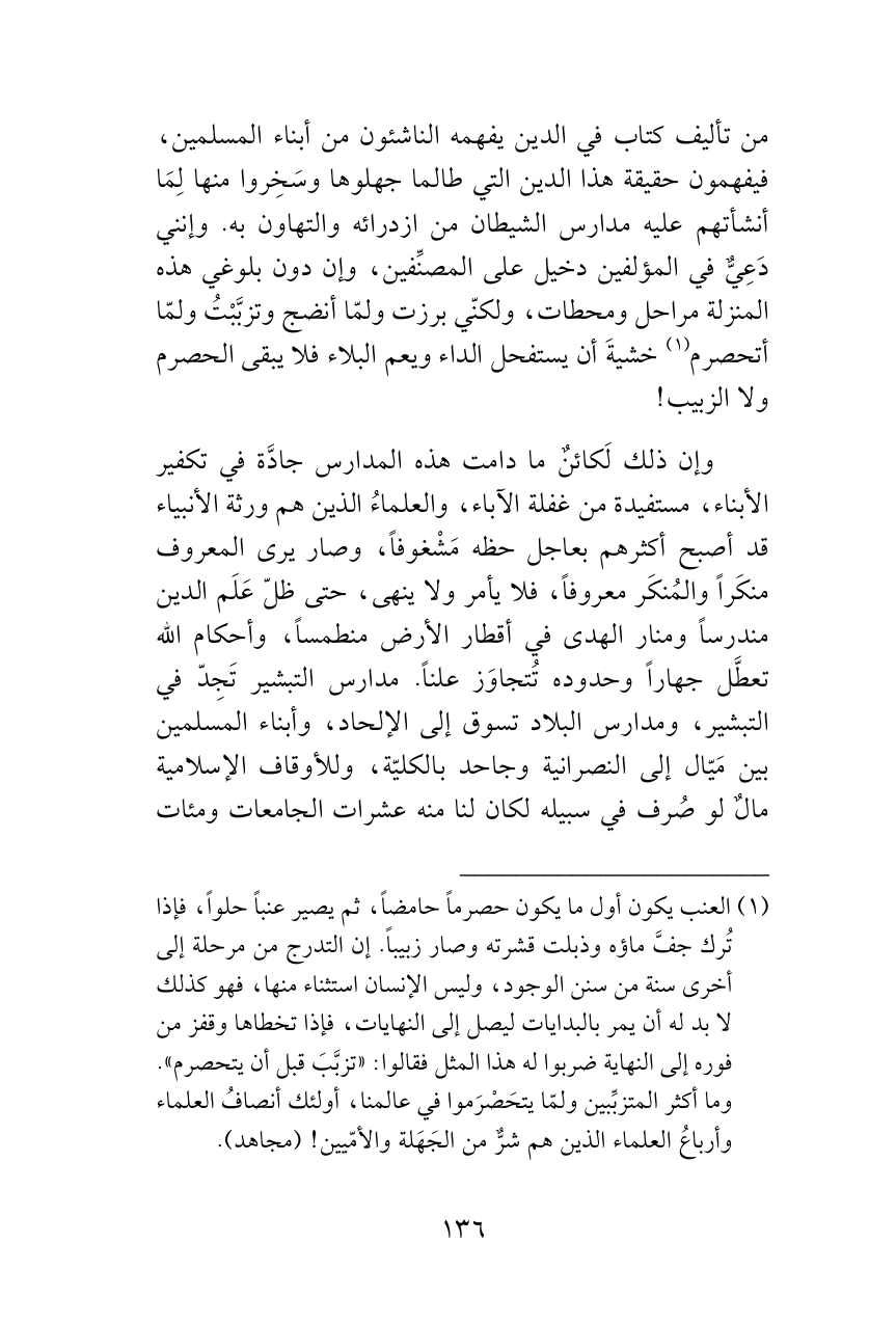 من تأليف كتاب في الدين يفهمه الناشئون من أبناء المسلمين، فيفهمون حقيقة هذا الدين التي طالما جهلوها وسَخِروا منها لِمَا أنشأتهم عليه مدارس الشيطان من ازدرائه والتهاون به. وإنني دَعِيٌّ في المؤلفين دخيل على المصنِّفين، وإن دون بلوغي هذه المنزلة مراحل ومحطات، ولكنّي برزت ولمّا أنضج وتزبَّبْتُ ولمّا أتحصرم (¬1) خشيةَ أن يستفحل الداء ويعم البلاء فلا يبقى الحصرم ولا الزبيب!