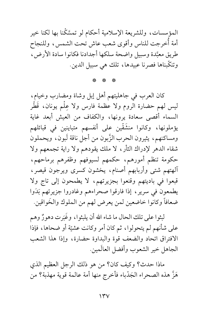 ماذا حدث؟ وكيف كان؟ من هو ذلك الرجل العظيم الذي هَزَّ هذه الصحراء الجَدْباء فأخرج منها أمة عالمة قوية مهذبة؟ من