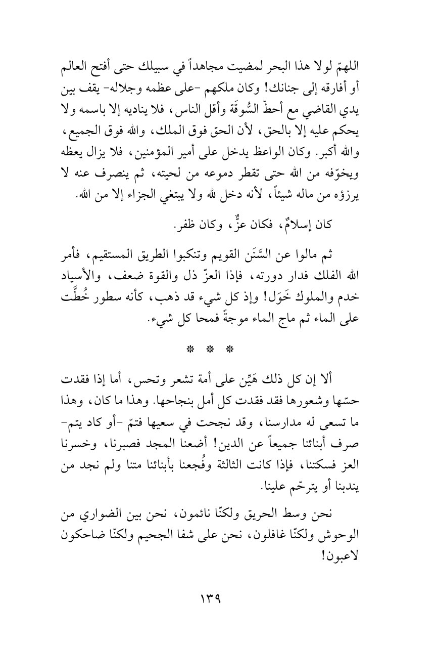 اللهمّ لولا هذا البحر لمضيت مجاهداً في سبيلك حتى أفتح العالم أو أفارقه إلى جنانك! وكان ملكهم -على عظمه وجلاله- يقف بين يدي القاضي مع أحطّ السُّوقَة وأقل الناس، فلا يناديه إلا باسمه ولا يحكم عليه إلا بالحق، لأن الحق فوق الملك، والله فوق الجميع، والله أكبر. وكان الواعظ يدخل على أمير المؤمنين، فلا يزال يعظه ويخوّفه من الله حتى تقطر دموعه من لحيته، ثم ينصرف عنه لا يرزؤه من ماله شيئاً، لأنه دخل لله ولا يبتغي الجزاء إلا من الله.