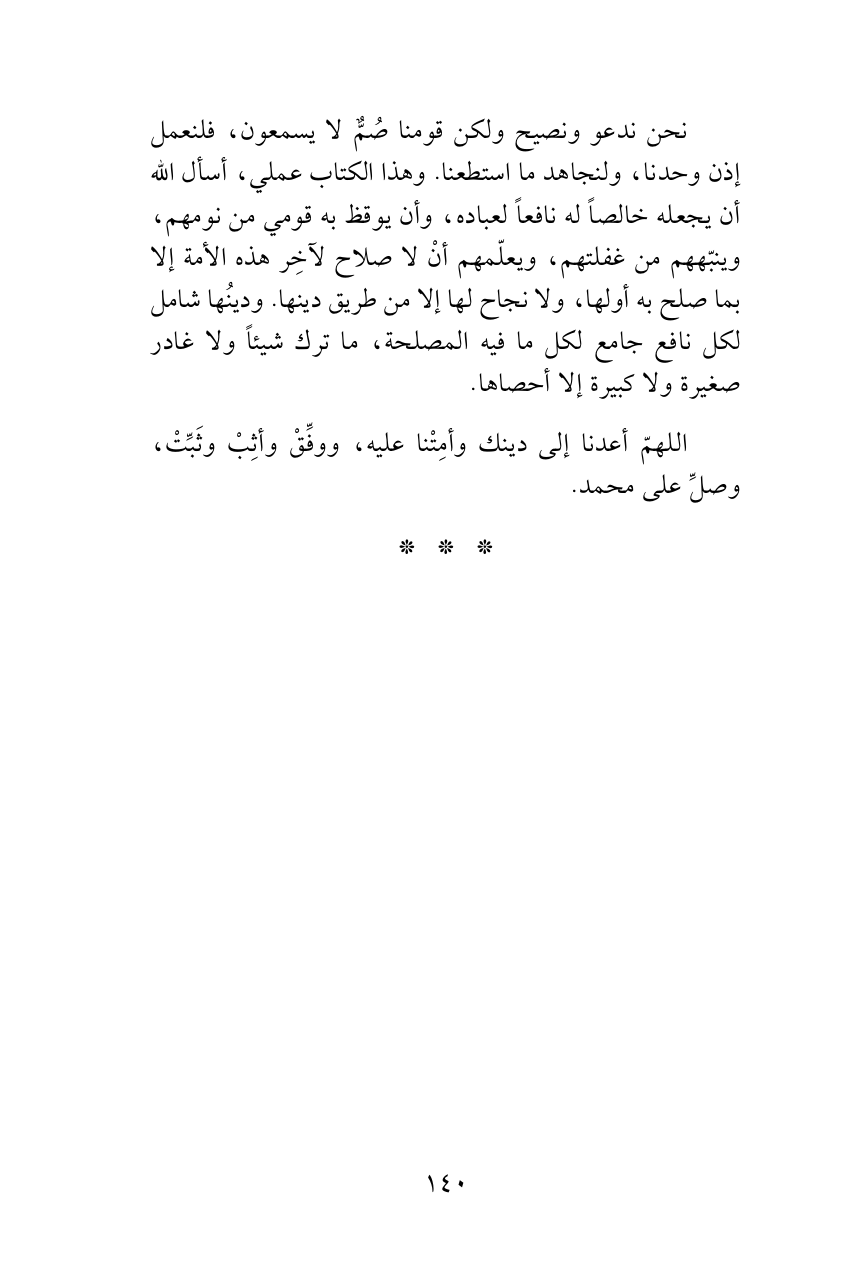 نحن ندعو ونصيح ولكن قومنا صُمٌّ لا يسمعون، فلنعمل إذن وحدنا، ولنجاهد ما استطعنا. وهذا الكتاب عملي، أسأل الله أن يجعله خالصاً له نافعاً لعباده، وأن يوقظ به قومي من نومهم، وينبّههم من غفلتهم، ويعلّمهم أنْ لا صلاح لآخِر هذه الأمة إلا بما صلح به أولها، ولا نجاح لها إلا من طريق دينها. ودينُها شامل لكل نافع جامع لكل ما فيه المصلحة، ما ترك شيئاً ولا غادر صغيرة ولا كبيرة إلا أحصاها.