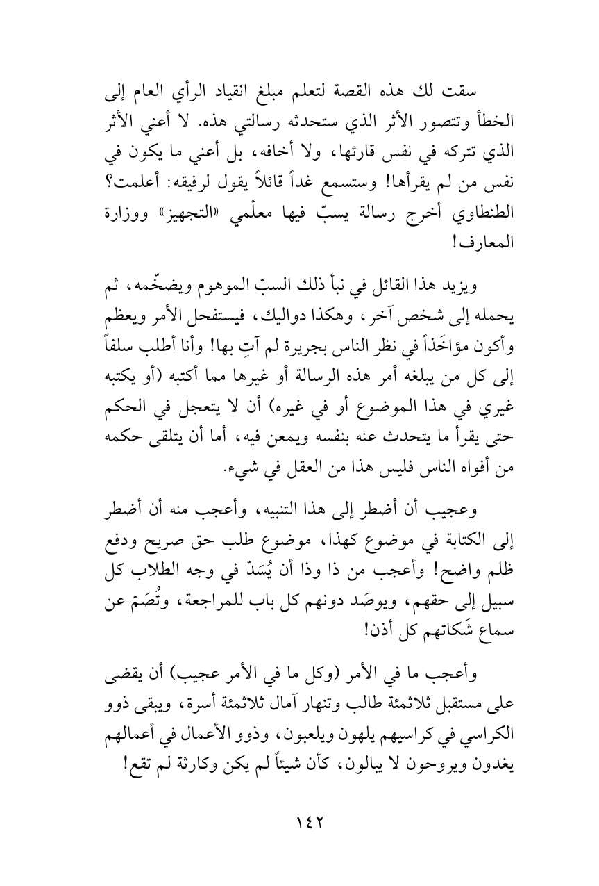 سقت لك هذه القصة لتعلم مبلغ انقياد الرأي العام إلى الخطأ وتتصور الأثر الذي ستحدثه رسالتي هذه. لا أعني الأثر الذي تتركه في نفس قارئها، ولا أخافه، بل أعني ما يكون في نفس من لم يقرأها! وستسمع غداً قائلاً يقول لرفيقه: أعلمت؟ الطنطاوي أخرج رسالة يسبّ فيها معلّمي «التجهيز» ووزارة المعارف!