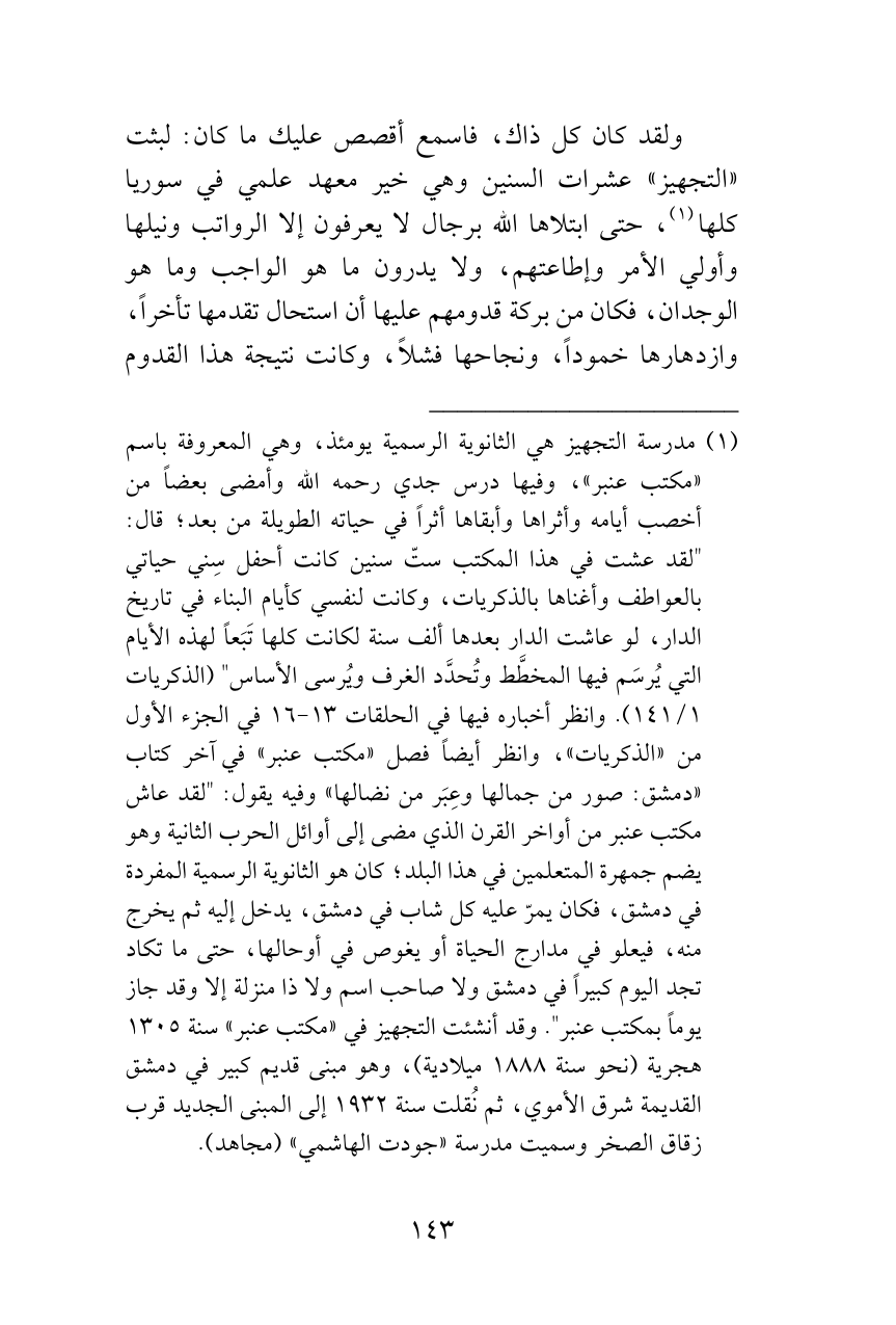(¬1) مدرسة التجهيز هي الثانوية الرسمية يومئذ، وهي المعروفة باسم «مكتب عنبر»، وفيها درس جدي رحمه الله وأمضى بعضاً من أخصب أيامه وأثراها وأبقاها أثراً في حياته الطويلة من بعد؛ قال: "لقد عشت في هذا المكتب ستّ سنين كانت أحفل سِني حياتي بالعواطف وأغناها بالذكريات، وكانت لنفسي كأيام البناء في تاريخ الدار، لو عاشت الدار بعدها ألف سنة لكانت كلها تَبَعاً لهذه الأيام التي يُرسَم فيها المخطَّط وتُحدَّد الغرف ويُرسى الأساس" (الذكريات 1/ 141). وانظر أخباره فيها في الحلقات 13 - 16 في الجزء الأول من «الذكريات»، وانظر أيضاً فصل «مكتب عنبر» في'آخر كتاب «دمشق: صور من جمالها وعِبَر من نضالها» وفيه يقول: "لقد عاش مكتب عنبر من أواخر القرن الذي مضى إلى أوائل الحرب الثانية وهو يضم جمهرة المتعلمين في هذا البلد؛ كان هو الثانوية الرسمية المفردة في دمشق، فكان يمرّ عليه كل شاب في دمشق، يدخل إليه ثم يخرج منه، فيعلو في مدارج الحياة أو يغوص في أوحالها، حتى ما تكاد تجد اليوم كبيراً في دمشق ولا صاحب اسم ولا ذا منزلة إلا وقد جاز يوماً بمكتب عنبر". وقد أنشئت التجهيز في «مكتب عنبر» سنة 1305 هجرية (نحو سنة 1888 ميلادية)، وهو مبنى قديم كبير في دمشق القديمة شرق الأموي، ثم نُقلت سنة 1932 إلى المبنى الجديد قرب زقاق الصخر وسميت مدرسة «جودت الهاشمي» (مجاهد).
