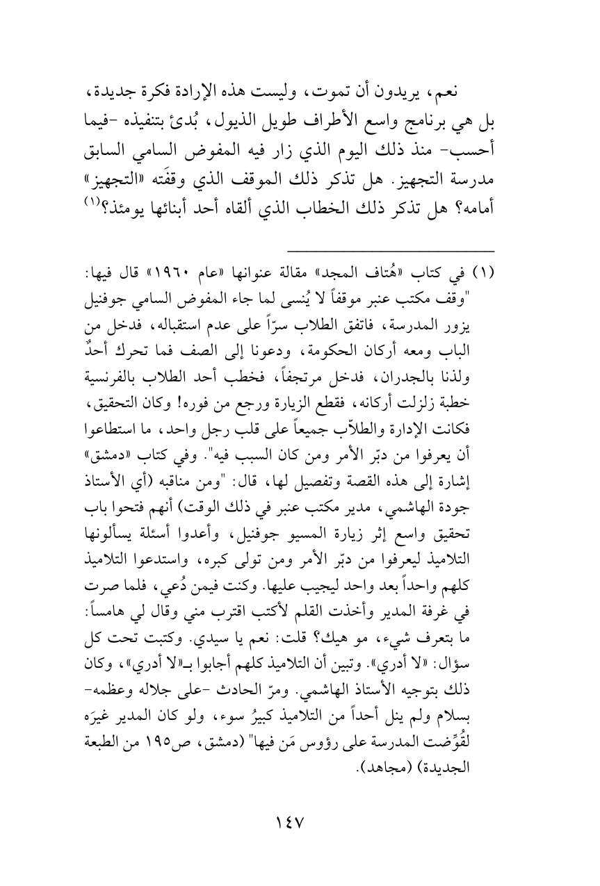 نعم، يريدون أن تموت، وليست هذه الإرادة فكرة جديدة، بل هي برنامج واسع الأطراف طويل الذيول، بُدئ بتنفيذه -فيما أحسب- منذ ذلك اليوم الذي زار فيه المفوض السامي السابق مدرسة التجهيز. هل تذكر ذلك الموقف الذي وقفَته «التجهيز» أمامه؟ هل تذكر ذلك الخطاب الذي ألقاه أحد أبنائها يومئذ؟ (¬1)