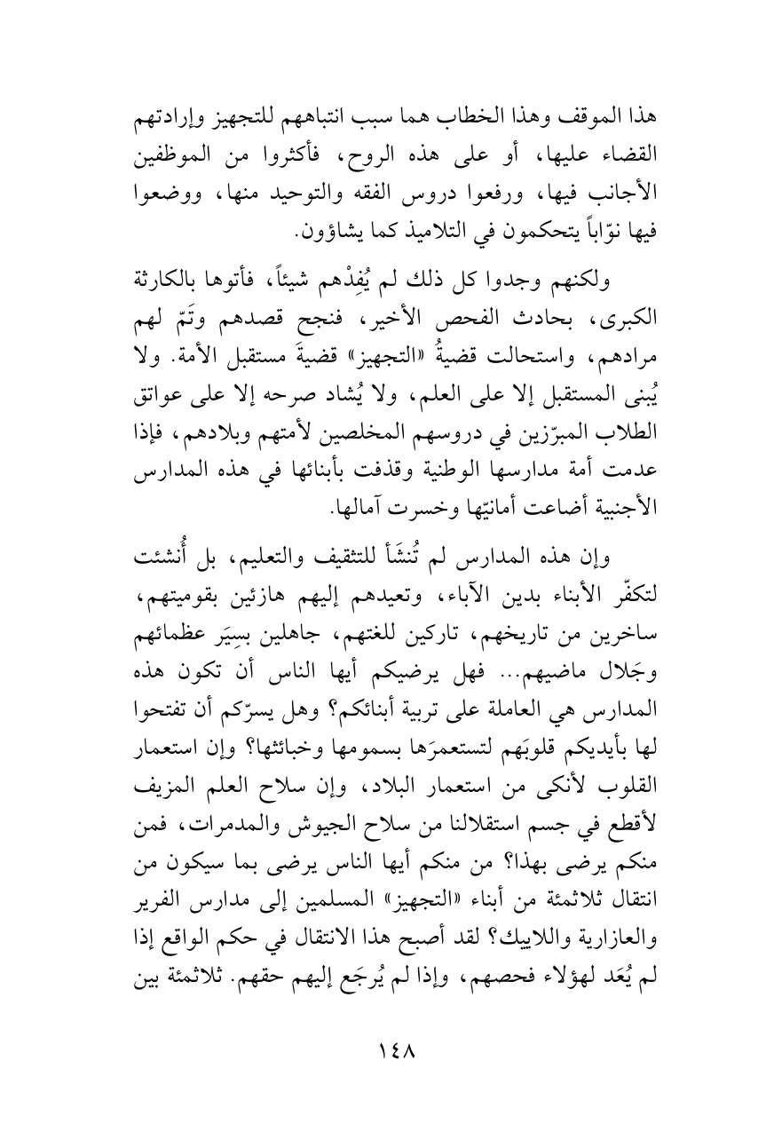 وإن هذه المدارس لم تُنشَأ للتثقيف والتعليم، بل أُنشئت لتكفّر الأبناء بدين الآباء، وتعيدهم إليهم هازئين بقوميتهم، ساخرين من تاريخهم، تاركين للغتهم، جاهلين بسِيَر عظمائهم وجَلال ماضيهم ... فهل يرضيكم أيها الناس أن تكون هذه المدارس هي العاملة على تربية أبنائكم؟ وهل يسرّكم أن تفتحوا لها بأيديكم قلوبَهم لتستعمرَها بسمومها وخبائثها؟ وإن استعمار القلوب لأنكى من استعمار البلاد، وإن سلاح العلم المزيف لأقطع في جسم استقلالنا من سلاح الجيوش والمدمرات، فمن منكم يرضى بهذا؟ من منكم أيها الناس يرضى بما سيكون من انتقال ثلاثمئة من أبناء «التجهيز» المسلمين إلى مدارس الفرير والعازارية واللاييك؟ لقد أصبح هذا الانتقال في حكم الواقع إذا لم يُعَد لهؤلاء فحصهم، وإذا لم يُرجَع إليهم حقهم. ثلاثمئة بين