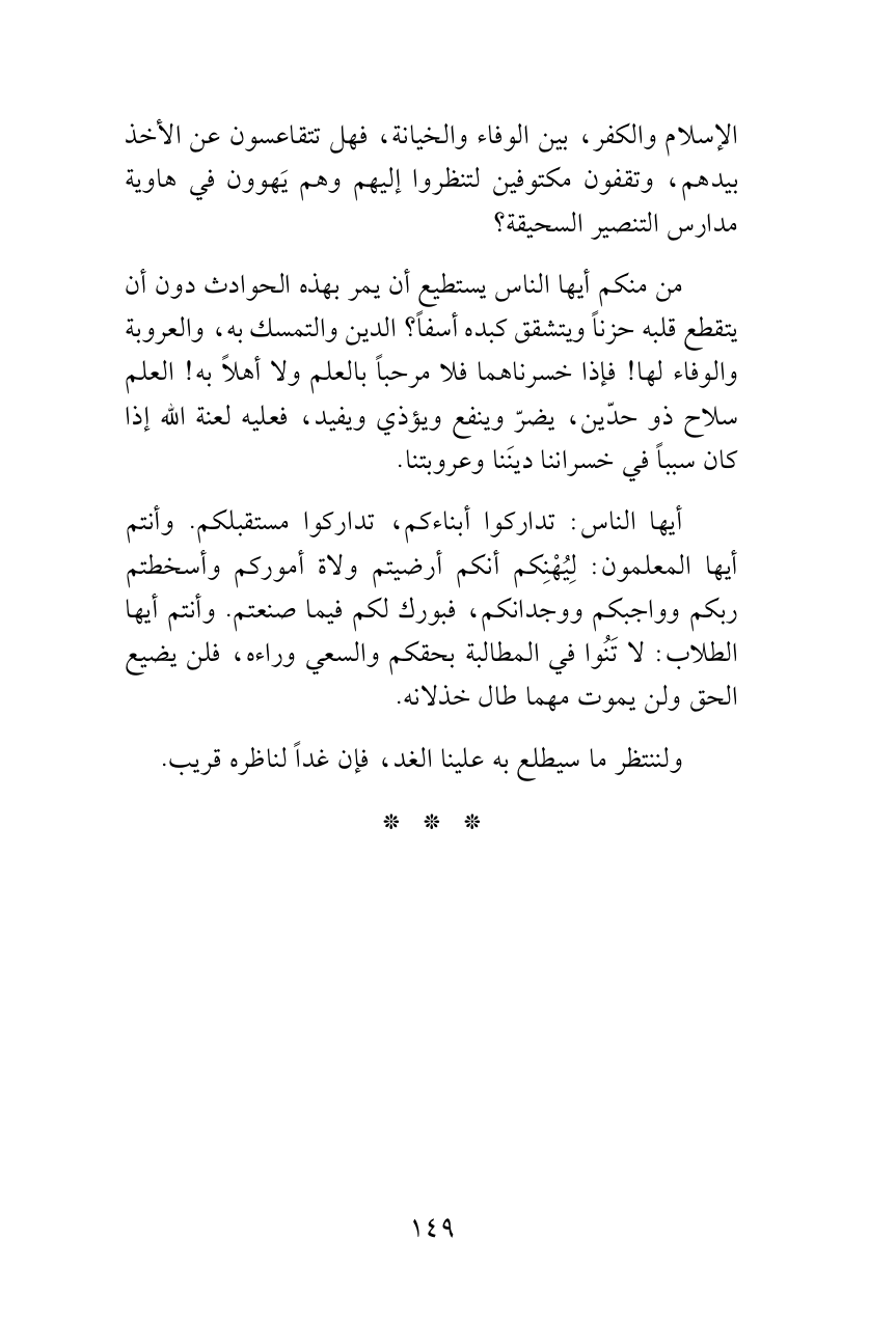 من منكم أيها الناس يستطيع أن يمر بهذه الحوادث دون أن يتقطع قلبه حزناً ويتشقق كبده أسفاً؟ الدين والتمسك به، والعروبة والوفاء لها! فإذا خسرناهما فلا مرحباً بالعلم ولا أهلاً به! العلم سلاح ذو حدّين، يضرّ وينفع ويؤذي ويفيد، فعليه لعنة الله إذا كان سبباً في خسراننا دينَنا وعروبتنا.