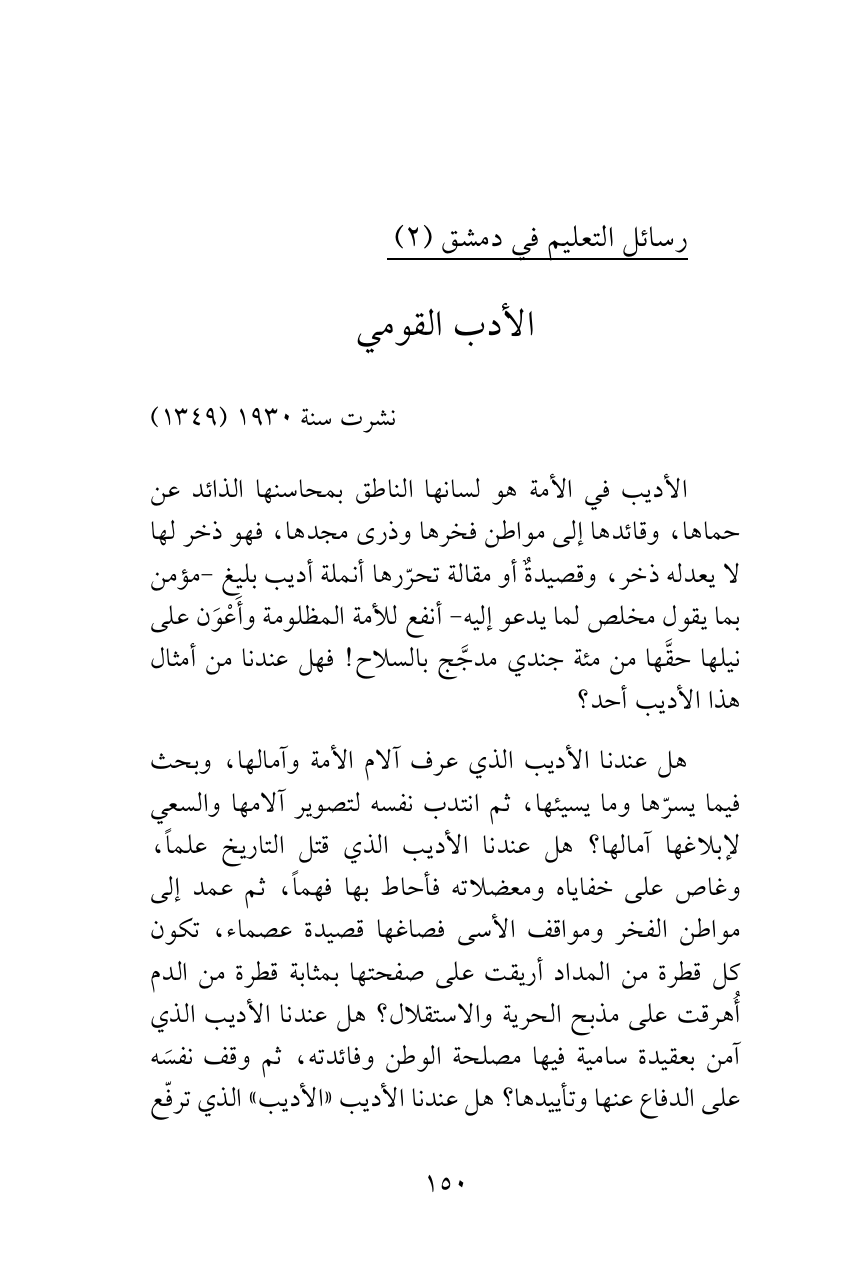 هل عندنا الأديب الذي عرف آلام الأمة وآمالها، وبحث فيما يسرّها وما يسيئها، ثم انتدب نفسه لتصوير آلامها والسعي لإبلاغها آمالها؟ هل عندنا الأديب الذي قتل التاريخ علماً، وغاص على خفاياه ومعضلاته فأحاط بها فهماً، ثم عمد إلى مواطن الفخر ومواقف الأسى فصاغها قصيدة عصماء، تكون كل قطرة من المداد أريقت على صفحتها بمثابة قطرة من الدم أُهرقت على مذبح الحرية والاستقلال؟ هل عندنا الأديب الذي آمن بعقيدة سامية فيها مصلحة الوطن وفائدته، ثم وقف نفسَه على الدفاع عنها وتأييدها؟ هل عندنا الأديب «الأديب» الذي ترفّع