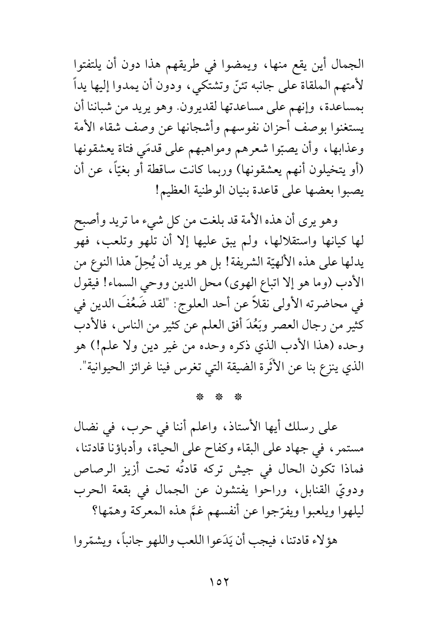 على رسلك أيها الأستاذ، واعلم أننا في حرب، في نضال مستمر، في جهاد على البقاء وكفاح على الحياة، وأدباؤنا قادتنا، فماذا تكون الحال في جيش تركه قادتُه تحت أزيز الرصاص ودويّ القنابل، وراحوا يفتشون عن الجمال في بقعة الحرب ليلهوا ويلعبوا ويفرّجوا عن أنفسهم غمَّ هذه المعركة وهمّها؟