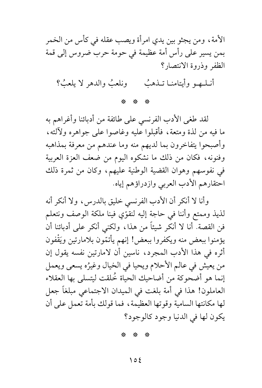 لقد طغى الأدب الفرنسي على طائفة من أدبائنا وأغراهم به ما فيه من لذة ومتعة، فأقبلوا عليه وغاصوا على جواهره ولآلئه، وأصبحوا يتفاخرون بما لديهم منه وما عندهم من معرفة بمذاهبه وفنونه، فكان من ذلك ما نشكوه اليوم من ضعف العزة العربية في نفوسهم وهوان القضية الوطنية عليهم، وكان من ثمرة ذلك احتقارهم الأدب العربي وازدراؤهم إياه.