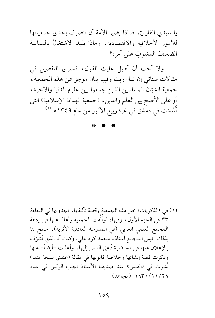 ولا أحب أن أطيل عليك القول، فسترى التفصيل في مقالات ستأتي إن شاء ربك وفيها بيان موجز عن هذه الجمعية، جمعية الشبّان المسلمين الذين جمعوا بين علوم الدنيا والآخرة، أو على الأصح بين العلم والدين، «جمعية الهداية الإسلامية» التي أُسِّسَت في دمشق في غرة ربيع الأنور من عام 1349هـ (¬1).
