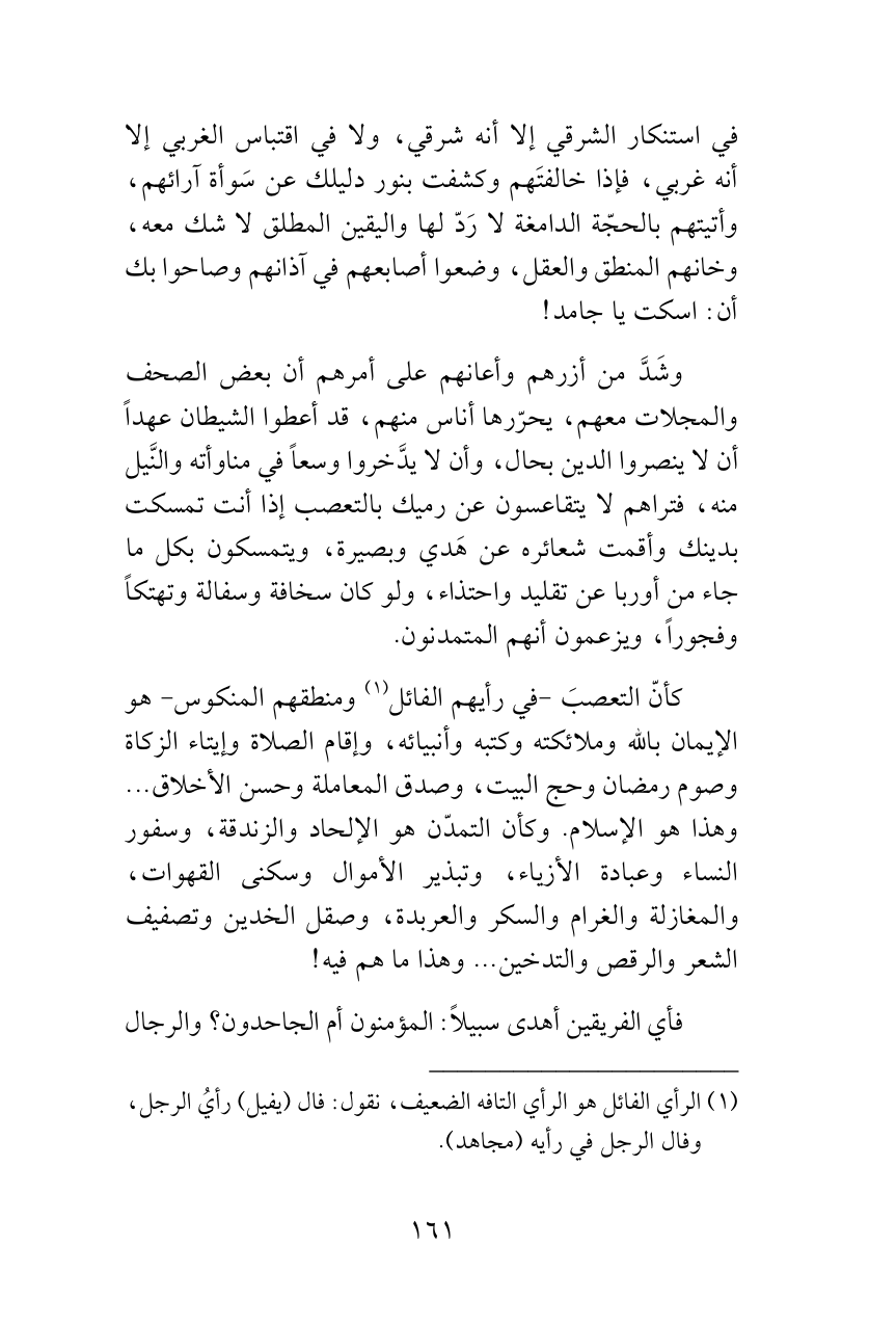 في استنكار الشرقي إلا أنه شرقي، ولا في اقتباس الغربي إلا أنه غربي، فإذا خالفتَهم وكشفت بنور دليلك عن سَوأة آرائهم، وأتيتهم بالحجّة الدامغة لا رَدّ لها واليقين المطلق لا شك معه، وخانهم المنطق والعقل، وضعوا أصابعهم في آذانهم وصاحوا بك أن: اسكت يا جامد!