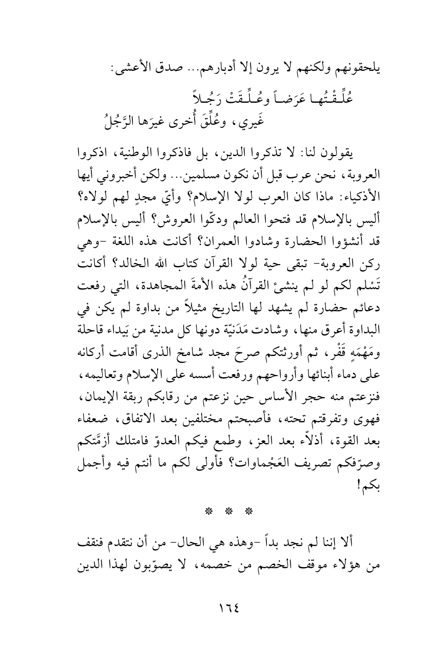 يقولون لنا: لا تذكروا الدين، بل فاذكروا الوطنية، اذكروا العروبة، نحن عرب قبل أن نكون مسلمين ... ولكن أخبروني أيها الأذكياء: ماذا كان العرب لولا الإسلام؟ وأيّ مجدٍ لهم لولاه؟ أليس بالإسلام قد فتحوا العالم ودكّوا العروش؟ أليس بالإسلام قد أنشؤوا الحضارة وشادوا العمران؟ أكانت هذه اللغة -وهي ركن العروبة- تبقى حية لولا القرآن كتاب الله الخالد؟ أكانت تَسْلم لكم لو لم ينشئ القرآنُ هذه الأمةَ المجاهدة، التي رفعت دعائم حضارة لم يشهد لها التاريخ مثيلاً من بداوة لم يكن في البداوة أعرق منها، وشادت مَدَنيّة دونها كل مدنية من بَيداء قاحلة ومَهْمَهٍ قَفْر، ثم أورثتكم صرحَ مجد شامخ الذرى أقامت أركانه على دماء أبنائها وأرواحهم ورفعت أسسه على الإسلام وتعاليمه، فنزعتم منه حجر الأساس حين نزعتم من رقابكم ربقة الإيمان، فهوى وتفرقتم تحته، فأصبحتم مختلفين بعد الاتفاق، ضعفاء بعد القوة، أذلاّء بعد العز، وطمع فيكم العدوّ فامتلك أزمَّتكم وصرّفكم تصريف العَجْماوات؟ فأولى لكم ما أنتم فيه وأجمل بكم!