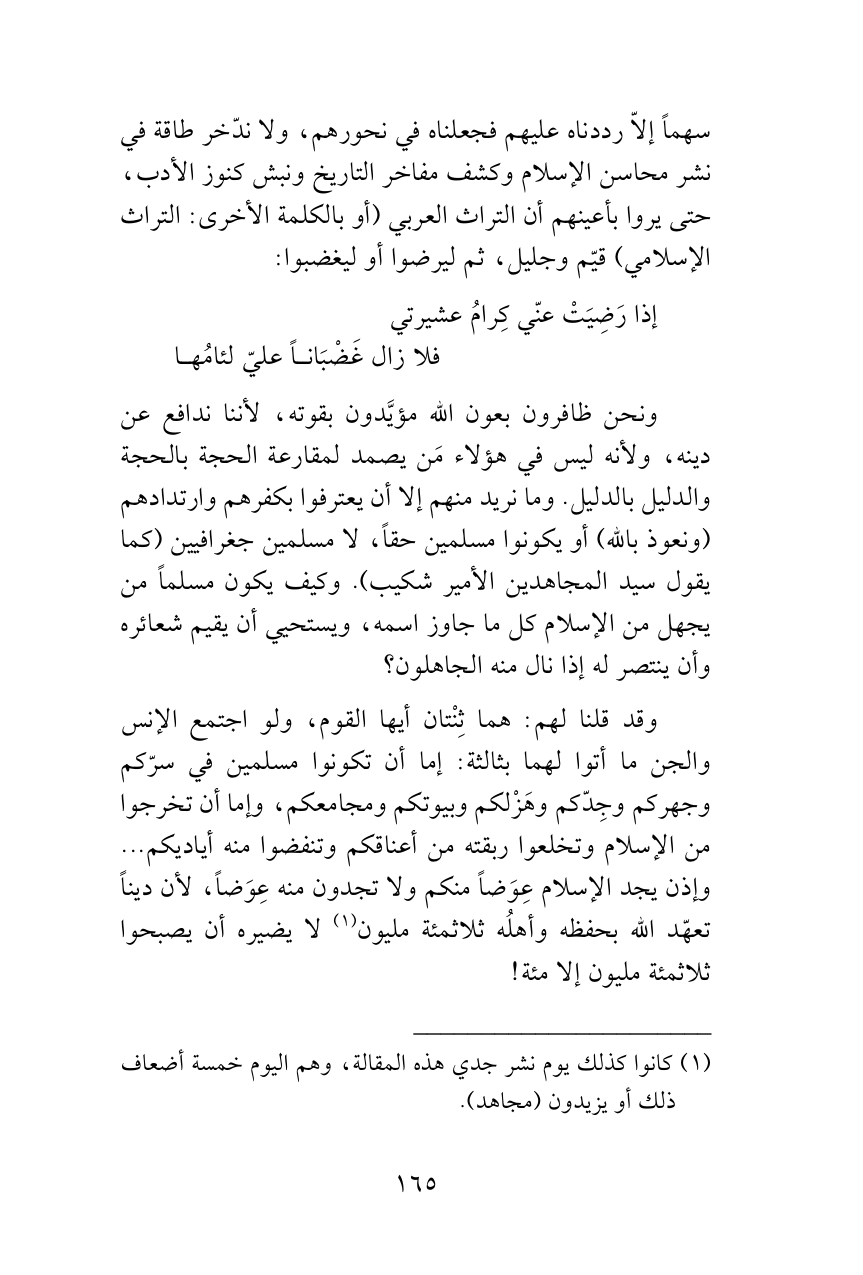 سهماً إلاّ رددناه عليهم فجعلناه في نحورهم، ولا ندّخر طاقة في نشر محاسن الإسلام وكشف مفاخر التاريخ ونبش كنوز الأدب، حتى يروا بأعينهم أن التراث العربي (أو بالكلمة الأخرى: التراث الإسلامي) قيّم وجليل، ثم ليرضوا أو ليغضبوا: