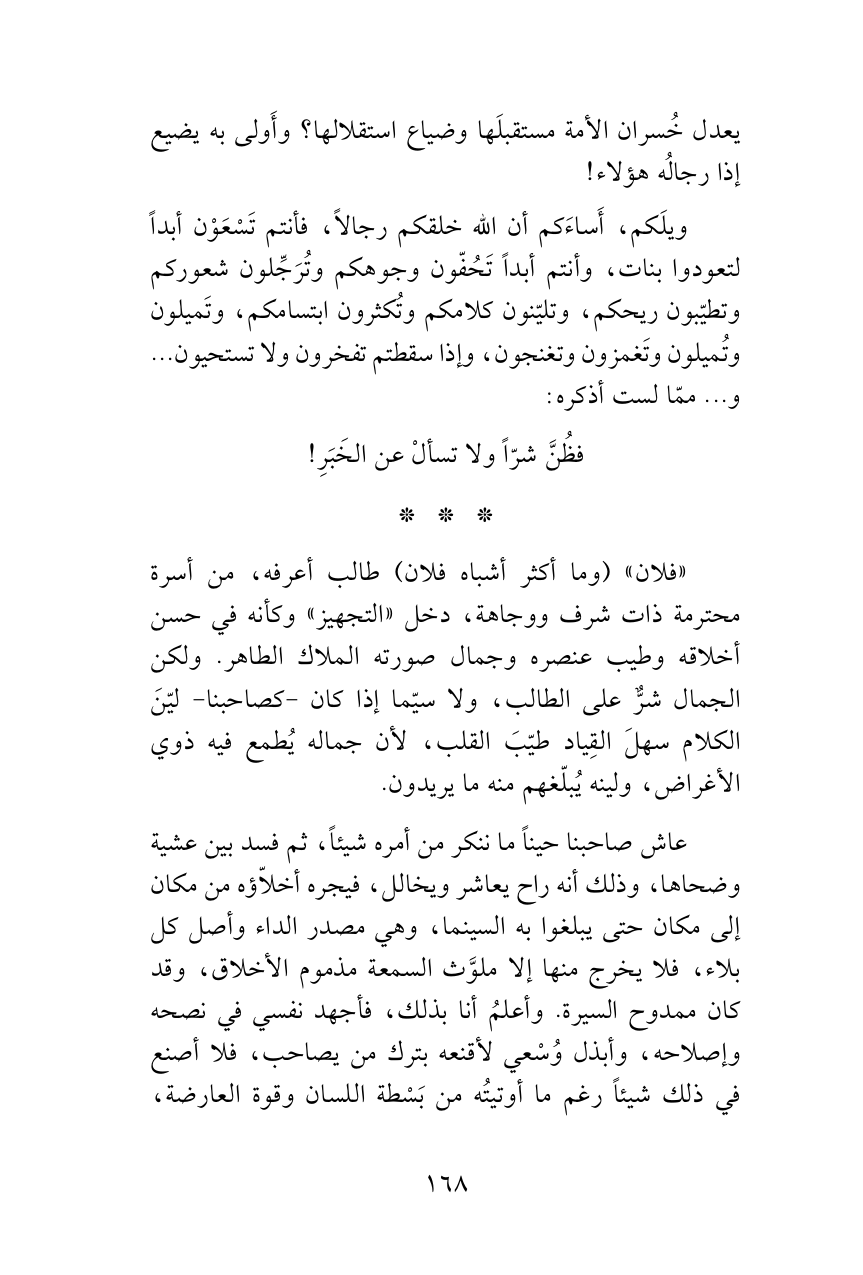 عاش صاحبنا حيناً ما ننكر من أمره شيئاً، ثم فسد بين عشية وضحاها، وذلك أنه راح يعاشر ويخالل، فيجره أخلاّؤه من مكان إلى مكان حتى يبلغوا به السينما، وهي مصدر الداء وأصل كل بلاء، فلا يخرج منها إلا ملوَّث السمعة مذموم الأخلاق، وقد كان ممدوح السيرة. وأعلمُ أنا بذلك، فأجهد نفسي في نصحه وإصلاحه، وأبذل وُسْعي لأقنعه بترك من يصاحب، فلا أصنع في ذلك شيئاً رغم ما أوتيتُه من بَسْطة اللسان وقوة العارضة،