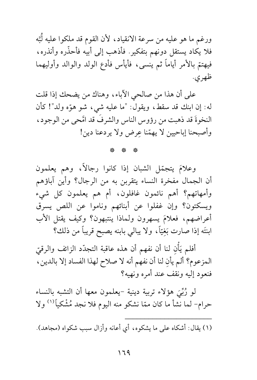 لو رُبِّيَ هؤلاء تربية دينية -يعلمون معها أن التشبه بالنساء حرام- لما نشأ ما كان ممّا نشكو منه اليوم فلا نجد مُشْكياً (¬1) ولا