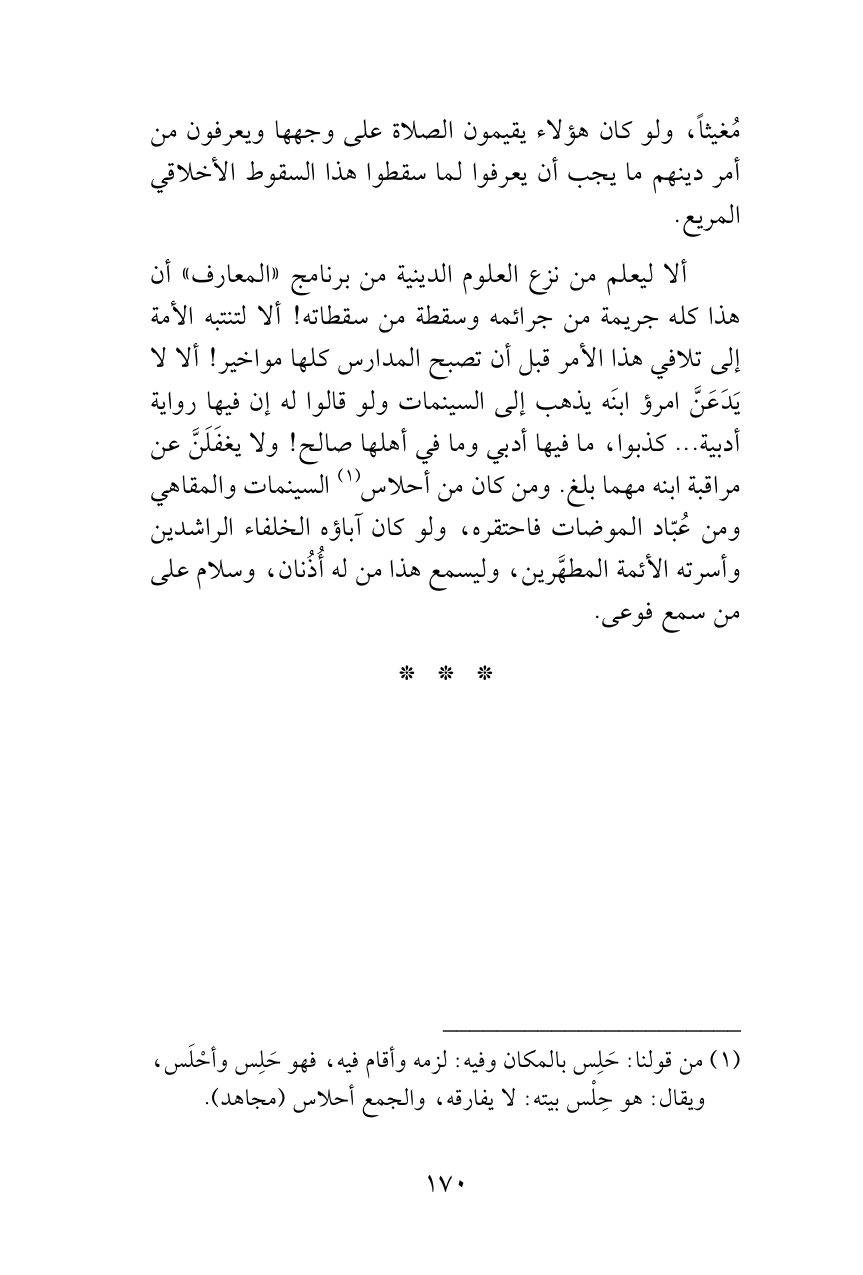 ألا ليعلم من نزع العلوم الدينية من برنامج «المعارف» أن هذا كله جريمة من جرائمه وسقطة من سقطاته! ألا لتنتبه الأمة إلى تلافي هذا الأمر قبل أن تصبح المدارس كلها مواخير! ألا لا يَدَعَنَّ امرؤ ابنَه يذهب إلى السينمات ولو قالوا له إن فيها رواية أدبية ... كذبوا، ما فيها أدبي وما في أهلها صالح! ولا يغفَلَنَّ عن مراقبة ابنه مهما بلغ. ومن كان من أحلاس (¬1) السينمات والمقاهي ومن عُبّاد الموضات فاحتقره، ولو كان آباؤه الخلفاء الراشدين وأسرته الأئمة المطهَّرين، وليسمع هذا من له أُذُنان، وسلام على من سمع فوعى.