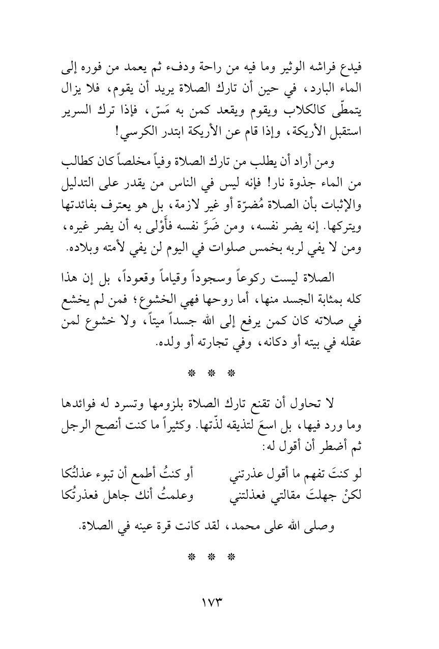 فيدع فراشه الوثير وما فيه من راحة ودفء ثم يعمد من فوره إلى الماء البارد، في حين أن تارك الصلاة يريد أن يقوم، فلا يزال يتمطّى كالكلاب ويقوم ويقعد كمن به مَسّ، فإذا ترك السرير استقبل الأريكة، وإذا قام عن الأريكة ابتدر الكرسي!