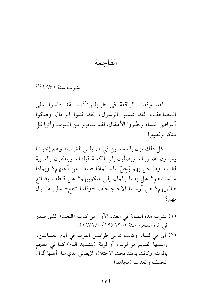 كل ذلك نزل بالمسلمين في طرابلس الغرب، وهم إخواننا يعبدون الله ربنا، ويصلّون إلى الكعبة قبلتنا، وينطقون بالعربية لغتنا، وما حل بهم يَحِلّ بنا، فماذا صنعنا من أجلهم؟ وبماذا ساعدناهم؟ هل بعثنا بالمال إلى منكوبيهم؟ هل قاطعنا بضائعَ ظالميهم؟ هل أرسلنا الاحتجاجات -وقلّما تنفع- على ما نزل بهم؟