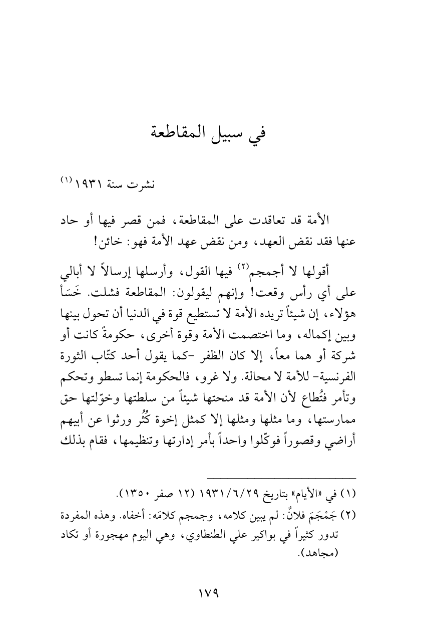 أقولها لا أجمجم (¬2) فيها القول، وأرسلها إرسالاً لا أبالي على أي رأس وقعت! وإنهم ليقولون: المقاطعة فشلت. خَسَأ هؤلاء، إن شيئاً تريده الأمة لا تستطيع قوة في الدنيا أن تحول بينها وبين إكماله، وما اختصمت الأمة وقوة أخرى، حكومةً كانت أو شركة أو هما معاً، إلا كان الظفر -كما يقول أحد كتّاب الثورة الفرنسية- للأمة لا محالة. ولا غرو، فالحكومة إنما تسطو وتحكم وتأمر فتُطاع لأن الأمة قد منحتها شيئاً من سلطتها وخوّلتها حق ممارستها، وما مثلها ومثلها إلا كمثل إخوة كُثُر ورثوا عن أبيهم أراضي وقصوراً فوكّلوا واحداً بأمر إدارتها وتنظيمها، فقام بذلك