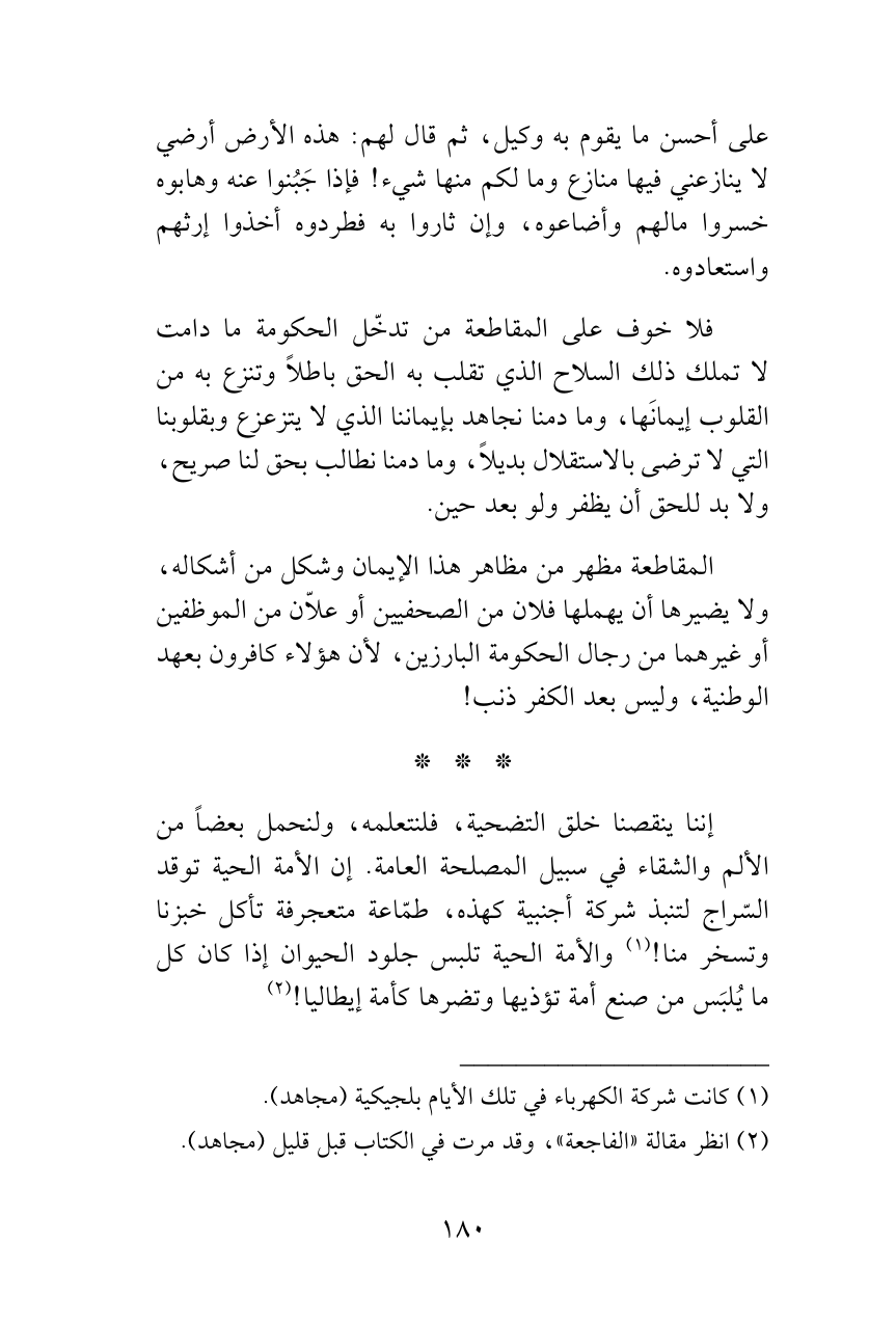 إننا ينقصنا خلق التضحية، فلنتعلمه، ولنحمل بعضاً من الألم والشقاء في سبيل المصلحة العامة. إن الأمة الحية توقد السّراج لتنبذ شركة أجنبية كهذه، طمّاعة متعجرفة تأكل خبزنا وتسخر منا! (¬1) والأمة الحية تلبس جلود الحيوان إذا كان كل ما يُلبَس من صنع أمة تؤذيها وتضرها كأمة إيطاليا! (¬2)