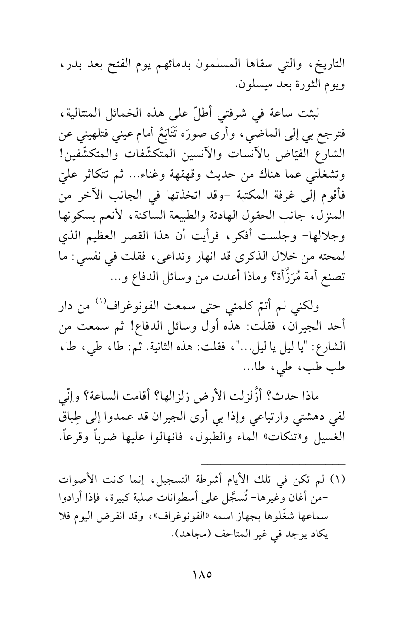 (¬1) لم تكن في تلك الأيام أشرطة التسجيل، إنما كانت الأصوات -من أغان وغيرها- تُسجَّل على أسطوانات صلبة كبيرة، فإذا أرادوا سماعها شغّلوها بجهاز اسمه «الفونوغراف»، وقد انقرض اليوم فلا يكاد يوجد في غير المتاحف (مجاهد).