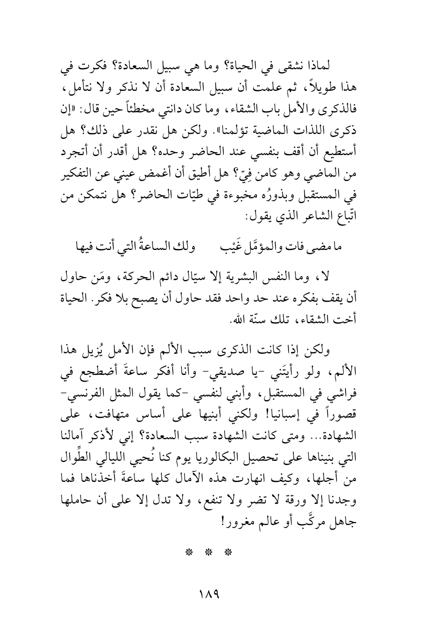 لماذا نشقى في الحياة؟ وما هي سبيل السعادة؟ فكرت في هذا طويلاً، ثم علمت أن سبيل السعادة أن لا نذكر ولا نتأمل، فالذكرى والأمل باب الشقاء، وما كان دانتي مخطئاً حين قال: «إن ذكرى اللذات الماضية تؤلمنا». ولكن هل نقدر على ذلك؟ هل أستطيع أن أقف بنفسي عند الحاضر وحده؟ هل أقدر أن أتجرد من الماضي وهو كامن فِيّ؟ هل أطيق أن أغمض عيني عن التفكير في المستقبل وبذورُه مخبوءة في طيّات الحاضر؟ هل نتمكن من اتّباع الشاعر الذي يقول: