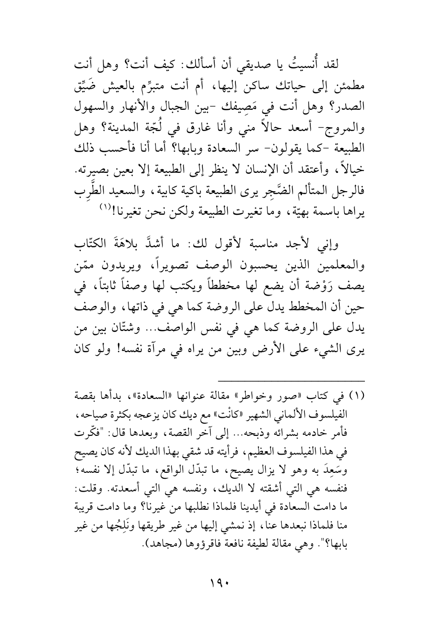 لقد أُنسيتُ يا صديقي أن أسألك: كيف أنت؟ وهل أنت مطمئن إلى حياتك ساكن إليها، أم أنت متبرِّم بالعيش ضَيِّق الصدر؟ وهل أنت في مَصِيفك -بين الجبال والأنهار والسهول والمروج- أسعد حالاً مني وأنا غارق في لُجّة المدينة؟ وهل الطبيعة -كما يقولون- سر السعادة وبابها؟ أما أنا فأحسب ذلك خيالاً، وأعتقد أن الإنسان لا ينظر إلى الطبيعة إلا بعين بصيرته. فالرجل المتألم الضَّجِر يرى الطبيعة باكية كابية، والسعيد الطَّرِب يراها باسمة بهيّة، وما تغيرت الطبيعة ولكن نحن تغيرنا! (¬1)