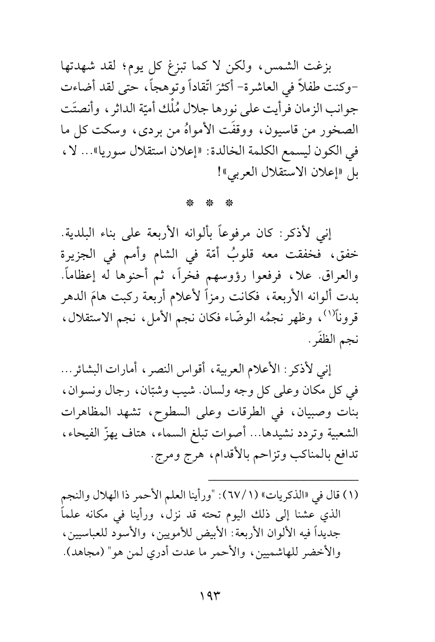 بزغت الشمس، ولكن لا كما تبزغ كل يوم؛ لقد شهدتها -وكنت طفلاً في العاشرة- أكثرَ اتّقاداً وتوهجاً، حتى لقد أضاءت جوانب الزمان فرأيت على نورها جلال مُلْك أميّة الداثر، وأنصتَت الصخور من قاسيون، ووقفَت الأمواهُ من بردى، وسكت كل ما في الكون ليسمع الكلمة الخالدة: «إعلان استقلال سوريا» ... لا، بل «إعلان الاستقلال العربي»!