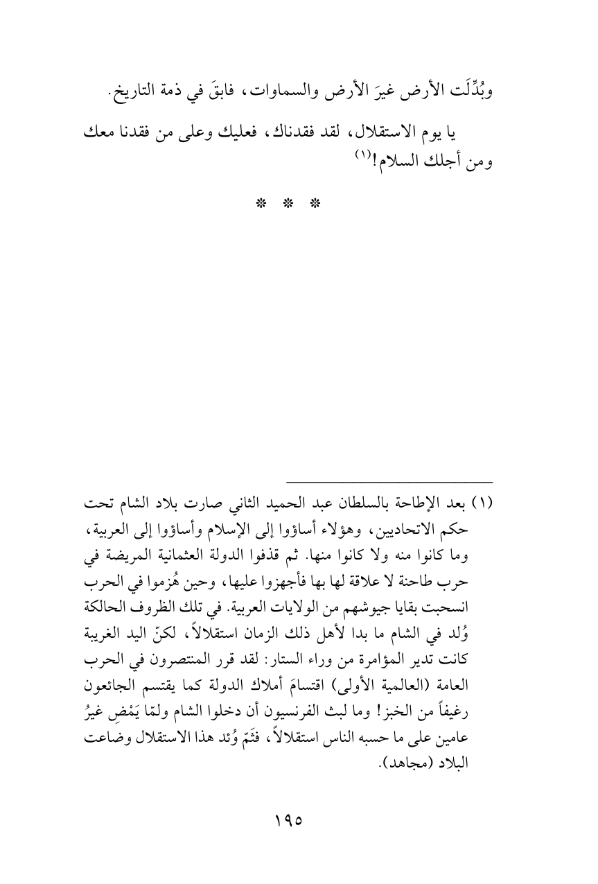 (¬1) بعد الإطاحة بالسلطان عبد الحميد الثاني صارت بلاد الشام تحت حكم الاتحاديين، وهؤلاء أساؤوا إلى الإسلام وأساؤوا إلى العربية، وما كانوا منه ولا كانوا منها. ثم قذفوا الدولة العثمانية المريضة في حرب طاحنة لا علاقة لها بها فأجهزوا عليها، وحين هُزموا في الحرب انسحبت بقايا جيوشهم من الولايات العربية. في تلك الظروف الحالكة وُلد في الشام ما بدا لأهل ذلك الزمان استقلالاً، لكنّ اليد الغريبة كانت تدير المؤامرة من وراء الستار: لقد قرر المنتصرون في الحرب العامة (العالمية الأولى) اقتسامَ أملاك الدولة كما يقتسم الجائعون رغيفاً من الخبز! وما لبث الفرنسيون أن دخلوا الشام ولمّا يَمْضِ غيرُ عامين على ما حسبه الناس استقلالاً، فثَمّ وُئد هذا الاستقلال وضاعت البلاد (مجاهد).