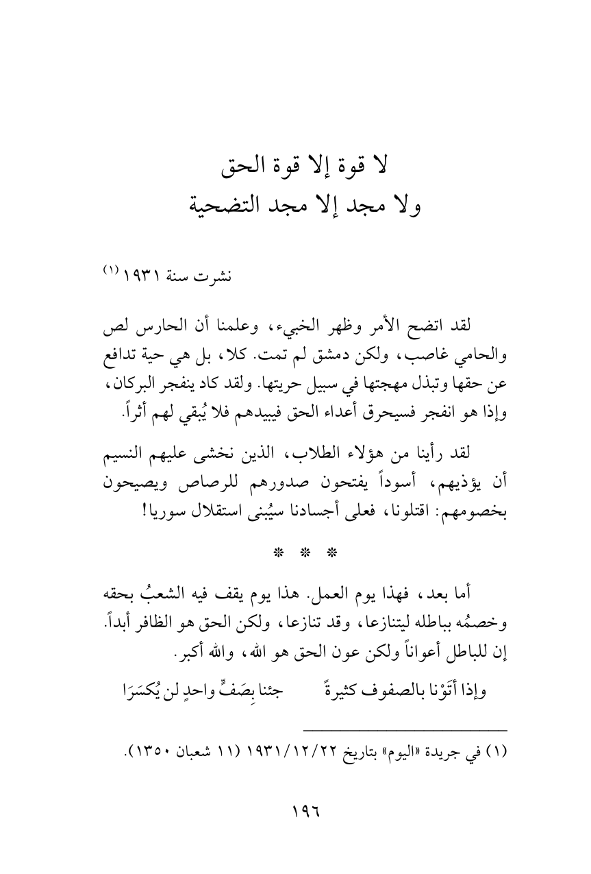 لقد اتضح الأمر وظهر الخبيء، وعلمنا أن الحارس لص والحامي غاصب، ولكن دمشق لم تمت. كلا، بل هي حية تدافع عن حقها وتبذل مهجتها في سبيل حريتها. ولقد كاد ينفجر البركان، وإذا هو انفجر فسيحرق أعداء الحق فيبيدهم فلا يُبقي لهم أثراً.