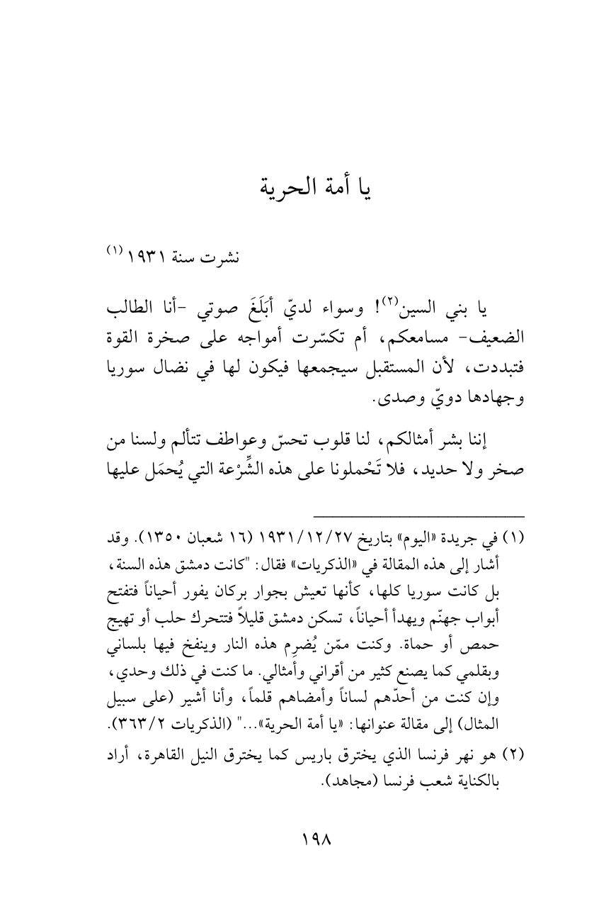 (¬1) في جريدة «اليوم» بتاريخ 27/ 12/1931 (16 شعبان 1350). وقد أشار إلى هذه المقالة في «الذكريات» فقال: "كانت دمشق هذه السنة، بل كانت سوريا كلها، كأنها تعيش بجوار بركان يفور أحياناً فتفتح أبواب جهنّم ويهدأ أحياناً، تسكن دمشق قليلاً فتتحرك حلب أو تهيج حمص أو حماة. وكنت ممّن يُضرِم هذه النار وينفخ فيها بلساني وبقلمي كما يصنع كثير من أقراني وأمثالي. ما كنت في ذلك وحدي، وإن كنت من أحدّهم لساناً وأمضاهم قلماً، وأنا أشير (على سبيل المثال) إلى مقالة عنوانها: «يا أمة الحرية» ... " (الذكريات 2/ 363).