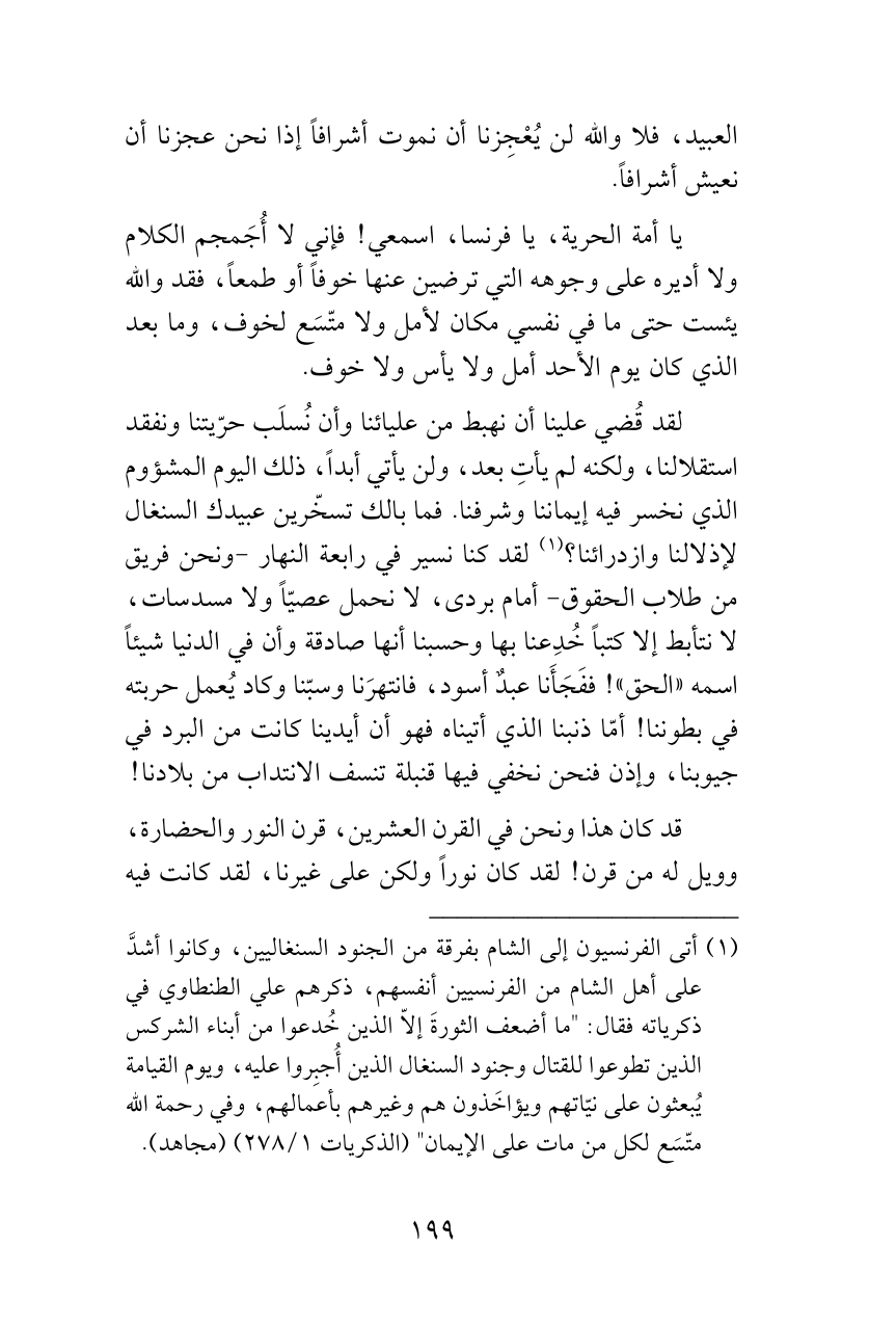 لقد قُضي علينا أن نهبط من عليائنا وأن نُسلَب حرّيتنا ونفقد استقلالنا، ولكنه لم يأتِ بعد، ولن يأتي أبداً، ذلك اليوم المشؤوم الذي نخسر فيه إيماننا وشرفنا. فما بالك تسخّرين عبيدك السنغال لإذلالنا وازدرائنا؟ (¬1) لقد كنا نسير في رابعة النهار -ونحن فريق من طلاب الحقوق- أمام بردى، لا نحمل عصيّاً ولا مسدسات، لا نتأبط إلا كتباً خُدِعنا بها وحسبنا أنها صادقة وأن في الدنيا شيئاً اسمه «الحق»! ففَجَأَنا عبدٌ أسود، فانتهرَنا وسبّنا وكاد يُعمل حربته في بطوننا! أمّا ذنبنا الذي أتيناه فهو أن أيدينا كانت من البرد في جيوبنا، وإذن فنحن نخفي فيها قنبلة تنسف الانتداب من بلادنا!