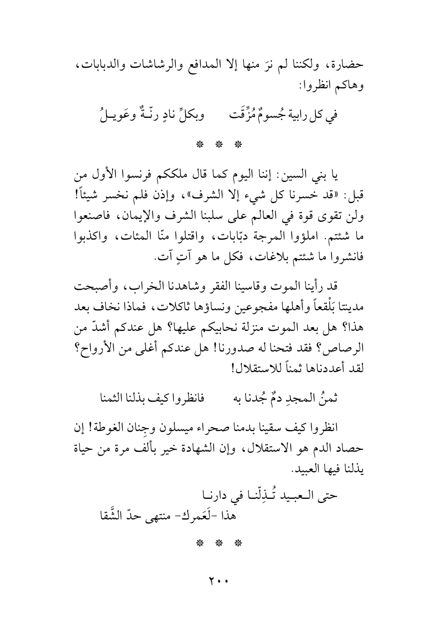 يا بني السين: إننا اليوم كما قال ملككم فرنسوا الأول من قبل: «قد خسرنا كل شيء إلا الشرف»، وإذن فلم نخسر شيئاً! ولن تقوى قوة في العالم على سلبنا الشرف والإيمان، فاصنعوا ما شئتم. املؤوا المرجة دبّابات، واقتلوا منّا المئات، واكذبوا فانشروا ما شئتم بلاغات، فكل ما هو آتٍ آت.