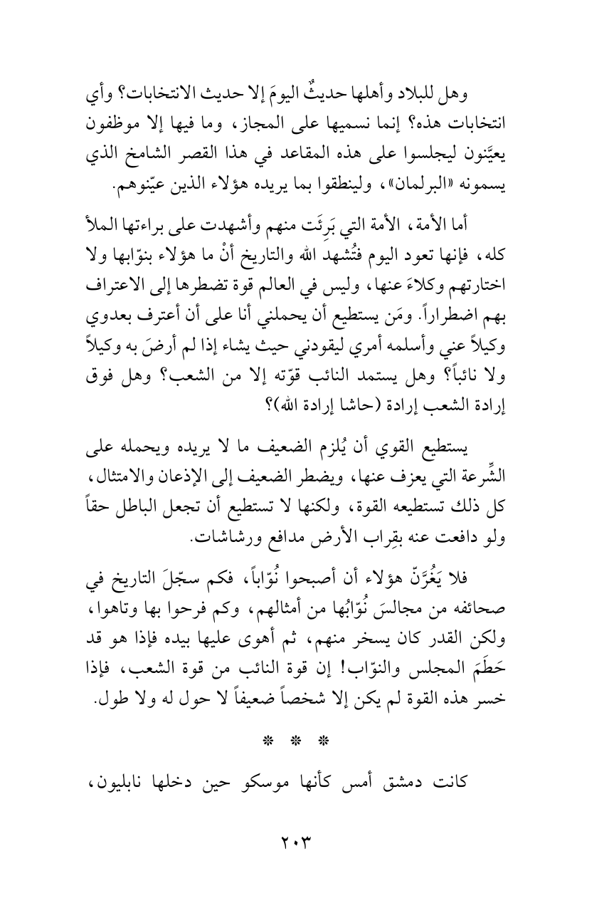 فلا يَغُرَّنّ هؤلاء أن أصبحوا نُوّاباً، فكم سجّلَ التاريخ في صحائفه من مجالسَ نُوّابُها من أمثالهم، وكم فرحوا بها وتاهوا، ولكن القدر كان يسخر منهم، ثم أهوى عليها بيده فإذا هو قد حَطَمَ المجلس والنوّاب! إن قوة النائب من قوة الشعب، فإذا خسر هذه القوة لم يكن إلا شخصاً ضعيفاً لا حول له ولا طول.