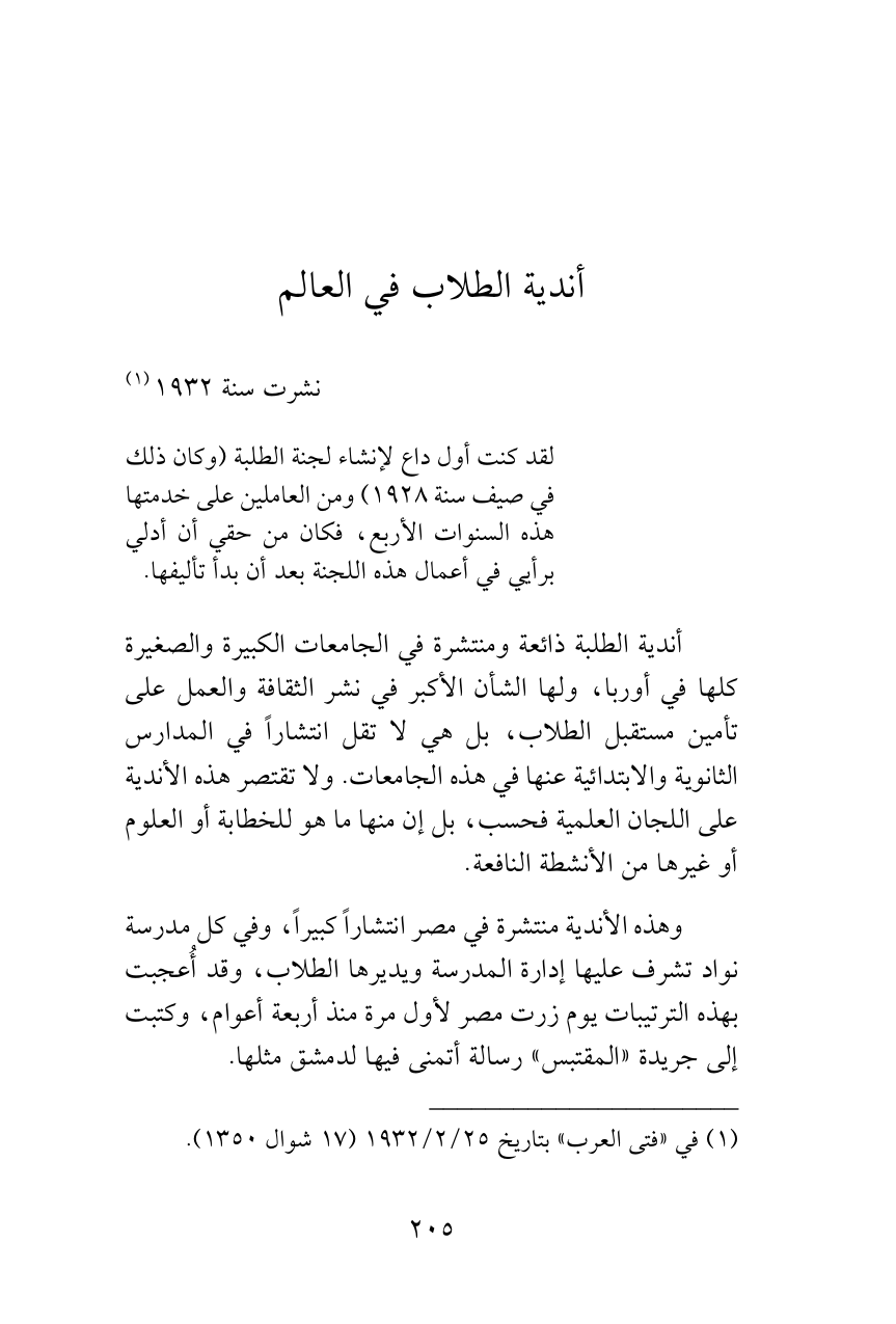 [لقد كنت أول داع لإنشاء لجنة الطلبة (وكان ذلك في صيف سنة 1928) ومن العاملين على خدمتها هذه السنوات الأربع، فكان من حقي أن أدلي برأيي في أعمال هذه اللجنة بعد أن بدأ تأليفها.]