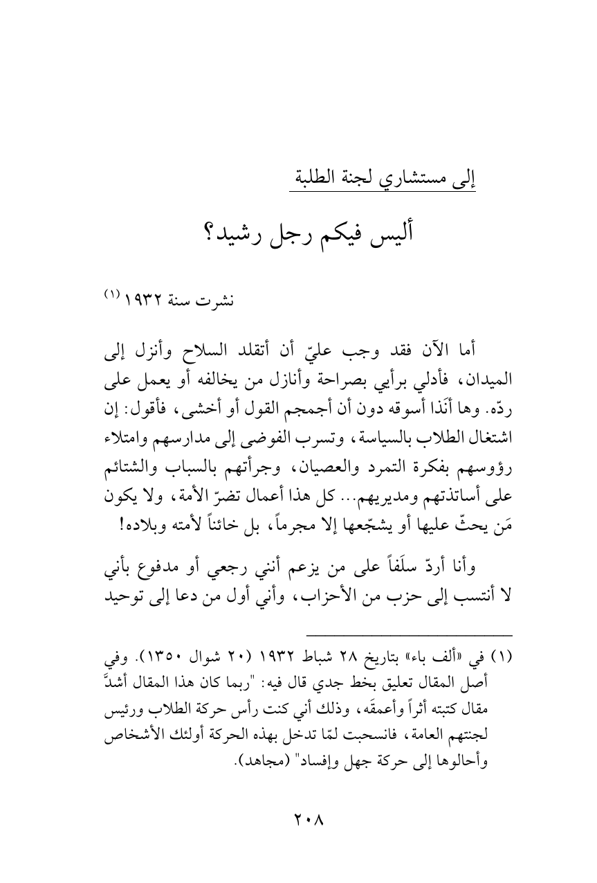 (¬1) في «ألف باء» بتاريخ 28 شباط 1932 (20 شوال 1350). وفي أصل المقال تعليق بخط جدي قال فيه: "ربما كان هذا المقال أشدَّ مقال كتبته أثراً وأعمقَه، وذلك أني كنت رأس حركة الطلاب ورئيس لجنتهم العامة، فانسحبت لمّا تدخل بهذه الحركة أولئك الأشخاص وأحالوها إلى حركة جهل وإفساد" (مجاهد).