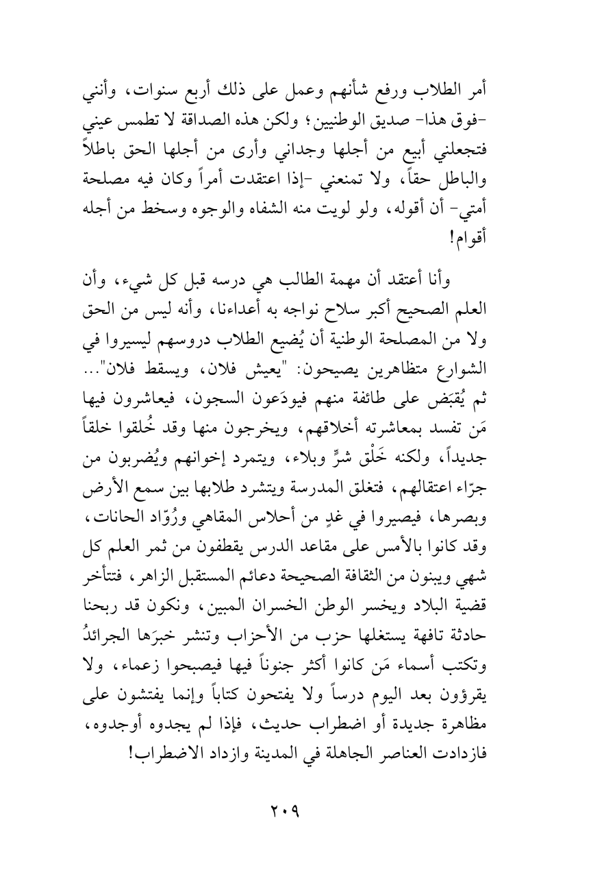 أمر الطلاب ورفع شأنهم وعمل على ذلك أربع سنوات، وأنني -فوق هذا- صديق الوطنيين؛ ولكن هذه الصداقة لا تطمس عيني فتجعلني أبيع من أجلها وجداني وأرى من أجلها الحق باطلاً والباطل حقاً، ولا تمنعني -إذا اعتقدت أمراً وكان فيه مصلحة أمتي- أن أقوله، ولو لويت منه الشفاه والوجوه وسخط من أجله أقوام!