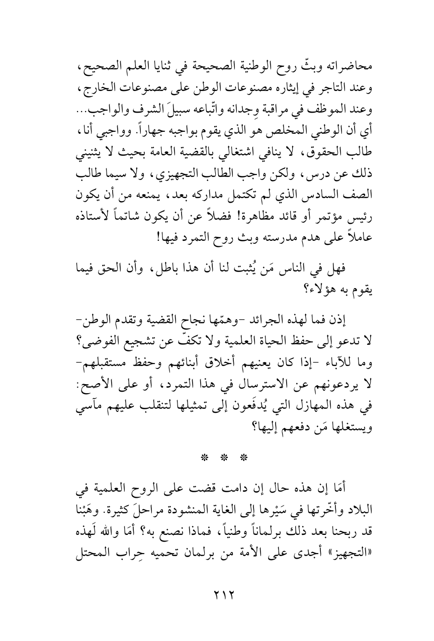 محاضراته وبثّ روح الوطنية الصحيحة في ثنايا العلم الصحيح، وعند التاجر في إيثاره مصنوعات الوطن على مصنوعات الخارج، وعند الموظف في مراقبة وِجدانه واتّباعه سبيلَ الشرف والواجب ... أي أن الوطني المخلص هو الذي يقوم بواجبه جهاراً. وواجبي أنا، طالب الحقوق، لا ينافي اشتغالي بالقضية العامة بحيث لا يثنيني ذلك عن درس، ولكن واجب الطالب التجهيزي، ولا سيما طالب الصف السادس الذي لم تكتمل مداركه بعد، يمنعه من أن يكون رئيس مؤتمر أو قائد مظاهرة! فضلاً عن أن يكون شاتماً لأستاذه عاملاً على هدم مدرسته وبث روح التمرد فيها!