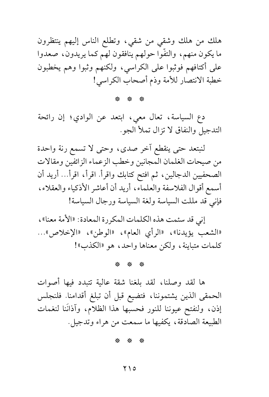 لنبتعد حتى ينقطع آخر صدى، وحتى لا تسمع رنة واحدة من صيحات الغلمان المجانين وخطب الزعماء الزائفين ومقالات الصحفيين الدجالين، ثم افتح كتابك واقرأ. اقرأ، اقرأ ... أريد أن أسمع أقوال الفلاسفة والعلماء، أريد أن أعاشر الأذكياء والعقلاء، فإني قد مللت السياسة ولغة السياسة ورجال السياسة!