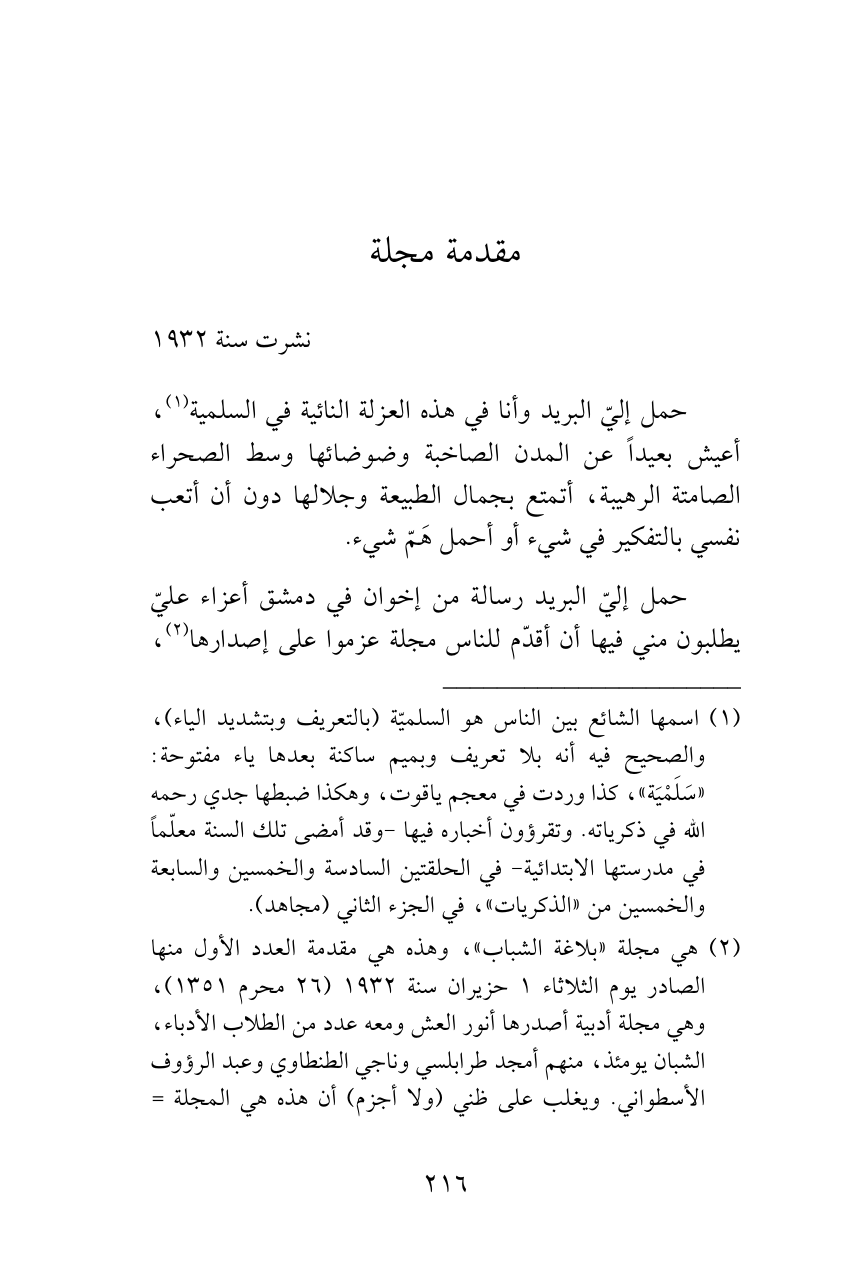 حمل إليّ البريد رسالة من إخوان في دمشق أعزاء عليّ يطلبون مني فيها أن أقدّم للناس مجلة عزموا على إصدارها (¬2)،