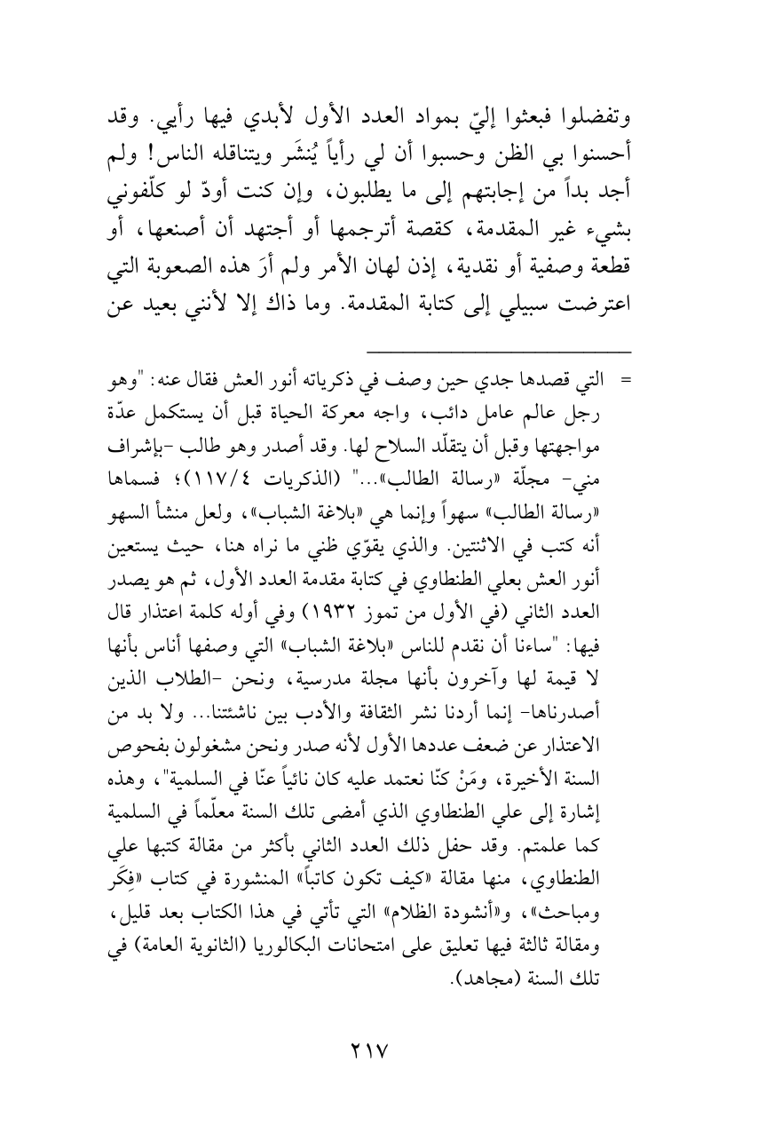 = التي قصدها جدي حين وصف في ذكرياته أنور العش فقال عنه: "وهو رجل عالم عامل دائب، واجه معركة الحياة قبل أن يستكمل عدّة مواجهتها وقبل أن يتقلّد السلاح لها. وقد أصدر وهو طالب -بإشراف مني- مجلّة «رسالة الطالب» ... " (الذكريات 4/ 117)؛ فسماها «رسالة الطالب» سهواً وإنما هي «بلاغة الشباب»، ولعل منشأ السهو أنه كتب في الاثنتين. والذي يقوّي ظني ما نراه هنا، حيث يستعين أنور العش بعلي الطنطاوي في كتابة مقدمة العدد الأول، ثم هو يصدر العدد الثاني (في الأول من تموز 1932) وفي أوله كلمة اعتذار قال فيها: "ساءنا أن نقدم للناس «بلاغة الشباب» التي وصفها أناس بأنها لا قيمة لها وآخرون بأنها مجلة مدرسية، ونحن -الطلاب الذين أصدرناها- إنما أردنا نشر الثقافة والأدب بين ناشئتنا ... ولا بد من الاعتذار عن ضعف عددها الأول لأنه صدر ونحن مشغولون بفحوص السنة الأخيرة، ومَنْ كنّا نعتمد عليه كان نائياً عنّا في السلمية"، وهذه إشارة إلى علي الطنطاوي الذي أمضى تلك السنة معلّماً في السلمية كما علمتم. وقد حفل ذلك العدد الثاني بأكثر من مقالة كتبها علي الطنطاوي، منها مقالة «كيف تكون كاتباً» المنشورة في كتاب «فِكَر ومباحث»، و «أنشودة الظلام» التي تأتي في هذا الكتاب بعد قليل، ومقالة ثالثة فيها تعليق على امتحانات البكالوريا (الثانوية العامة) في تلك السنة (مجاهد).