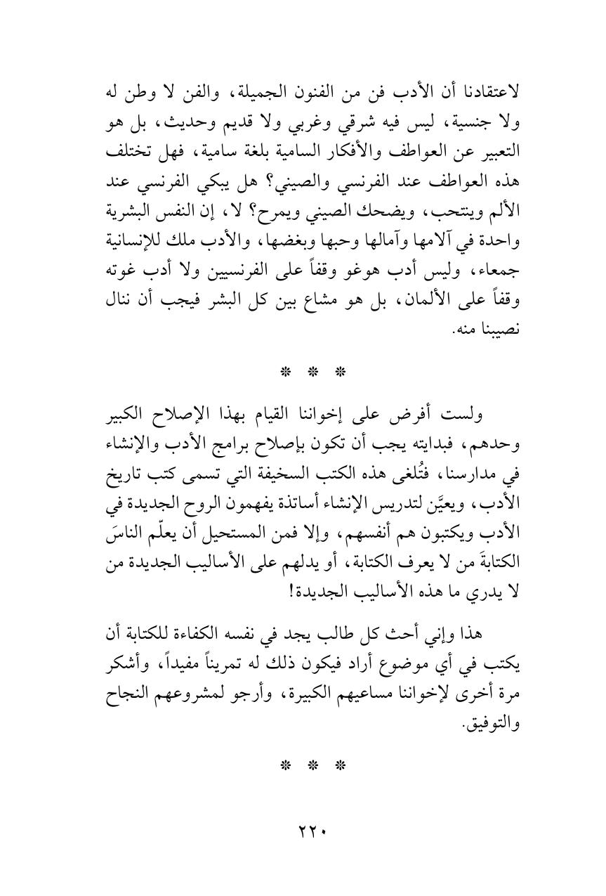 ولست أفرض على إخواننا القيام بهذا الإصلاح الكبير وحدهم، فبدايته يجب أن تكون بإصلاح برامج الأدب والإنشاء في مدارسنا، فتُلغى هذه الكتب السخيفة التي تسمى كتب تاريخ الأدب، ويعيَّن لتدريس الإنشاء أساتذة يفهمون الروح الجديدة في الأدب ويكتبون هم أنفسهم، وإلا فمن المستحيل أن يعلّم الناسَ الكتابةَ من لا يعرف الكتابة، أو يدلهم على الأساليب الجديدة من لا يدري ما هذه الأساليب الجديدة!