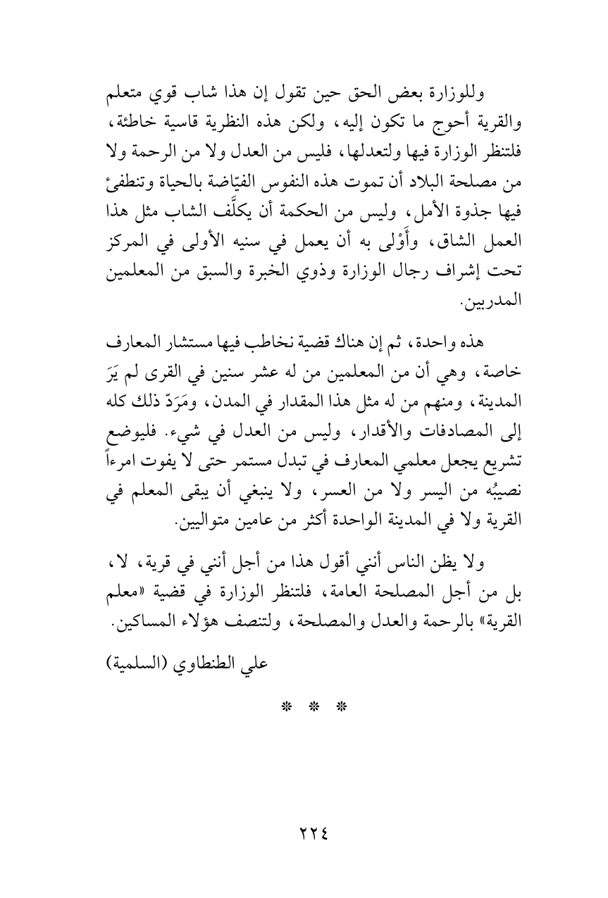 ولا يظن الناس أنني أقول هذا من أجل أنني في قرية، لا، بل من أجل المصلحة العامة، فلتنظر الوزارة في قضية «معلم القرية» بالرحمة والعدل والمصلحة، ولتنصف هؤلاء المساكين.
