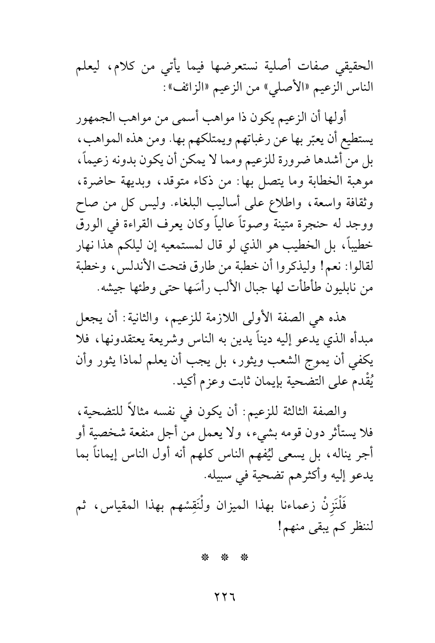 أولها أن الزعيم يكون ذا مواهب أسمى من مواهب الجمهور يستطيع أن يعبّر بها عن رغباتهم ويمتلكهم بها. ومن هذه المواهب، بل من أشدها ضرورة للزعيم ومما لا يمكن أن يكون بدونه زعيماً، موهبة الخطابة وما يتصل بها: من ذكاء متوقد، وبديهة حاضرة، وثقافة واسعة، واطلاع على أساليب البلغاء. وليس كل من صاح ووجد له حنجرة متينة وصوتاً عالياً وكان يعرف القراءة في الورق خطيباً، بل الخطيب هو الذي لو قال لمستمعيه إن ليلكم هذا نهار لقالوا: نعم! وليذكروا أن خطبة من طارق فتحت الأندلس، وخطبة من نابليون طأطأت لها جبال الألب رأسَها حتى وطئها جيشه.